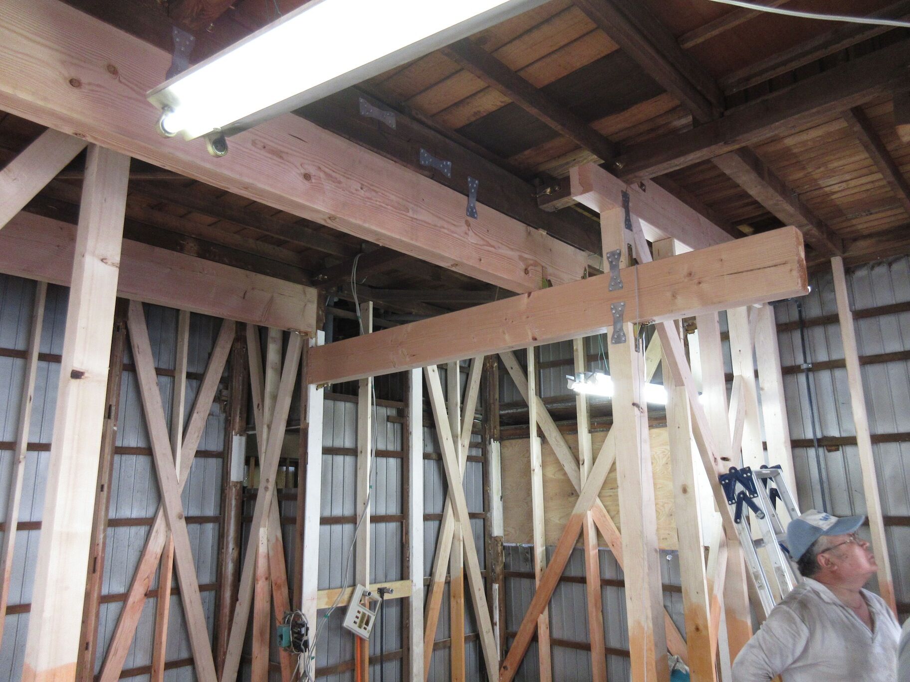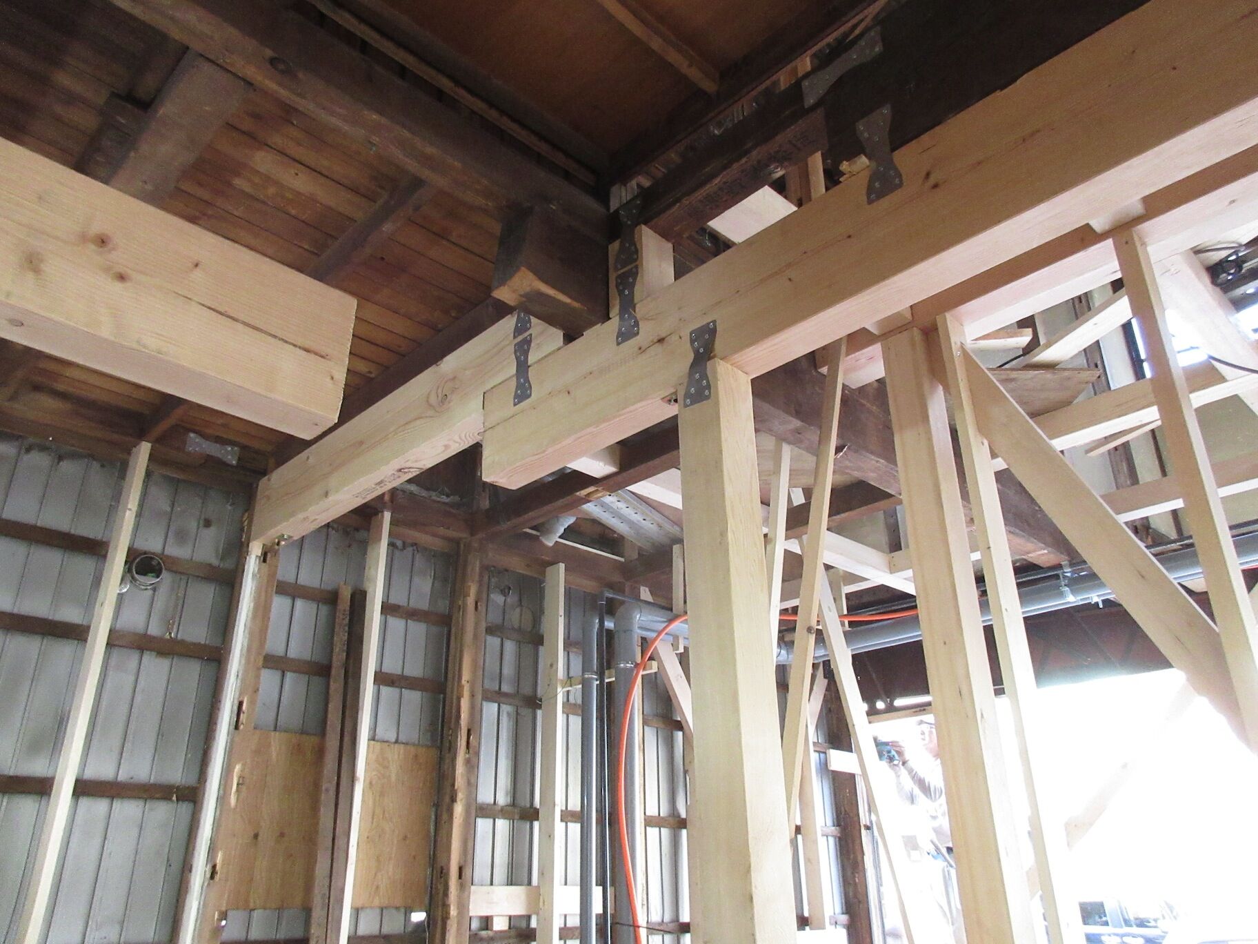 柱が抜かれる所は梁を補強。既存の梁を残してその下側に新たな梁を架けるので、パッと見結構アクロバティックな状態になっている。今回は鉄骨などを用いずに、それでも極力天井高を確保することが重要だ。