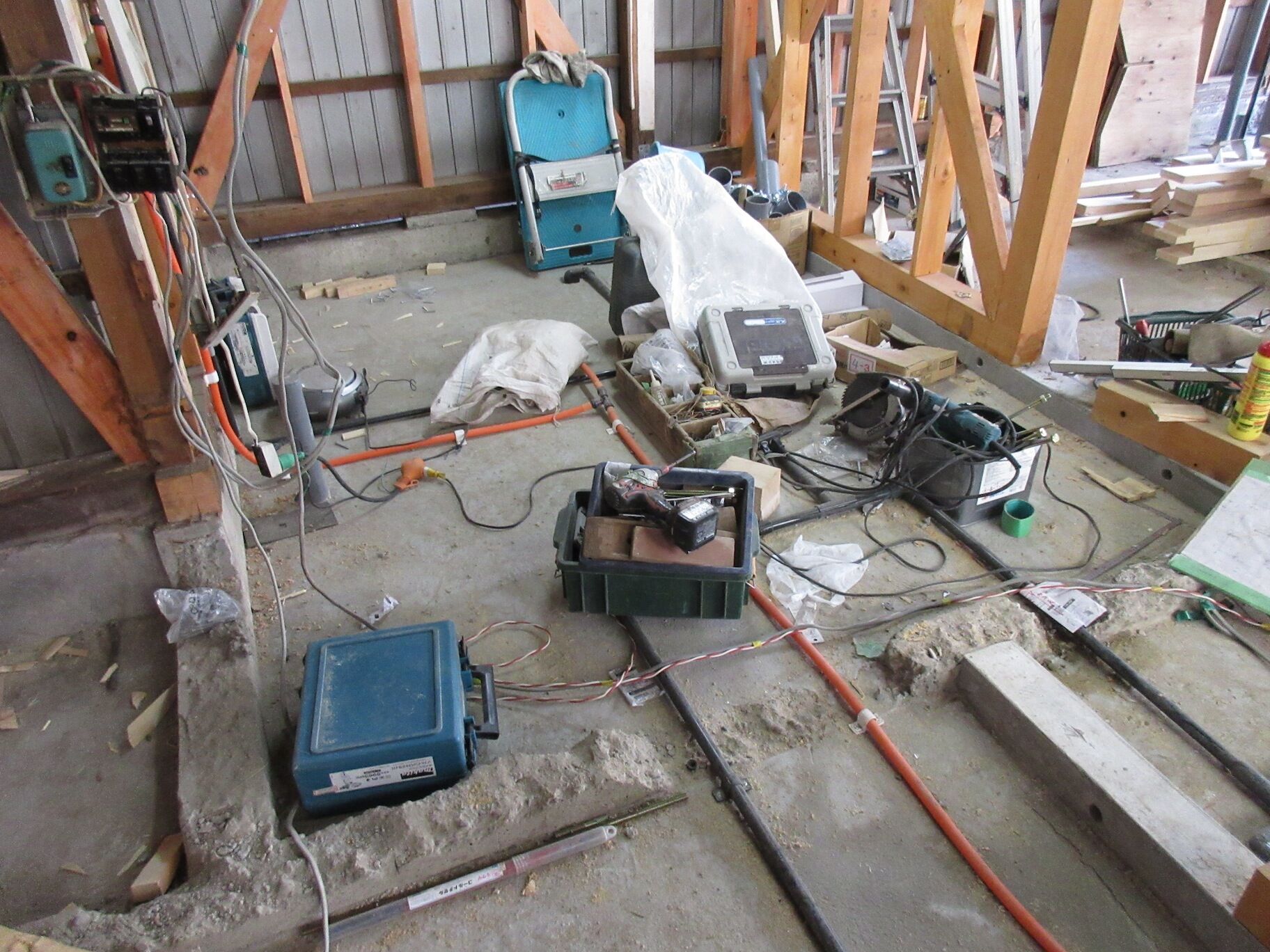 新たに耐力壁となる部分に基礎を立ち上げ、土間のコンクリートも打設された。さらには土台が敷かれて柱が立って筋交いが入るという、新築の工程と同じように進む。今日は大工さんが4人も入っていた。