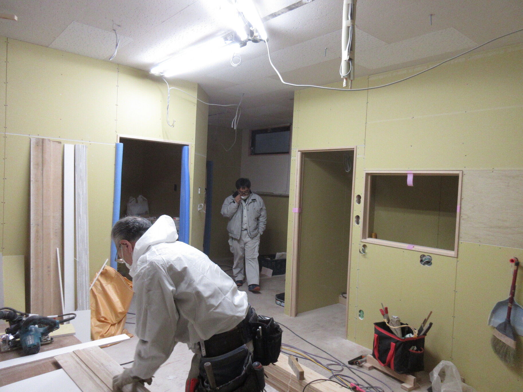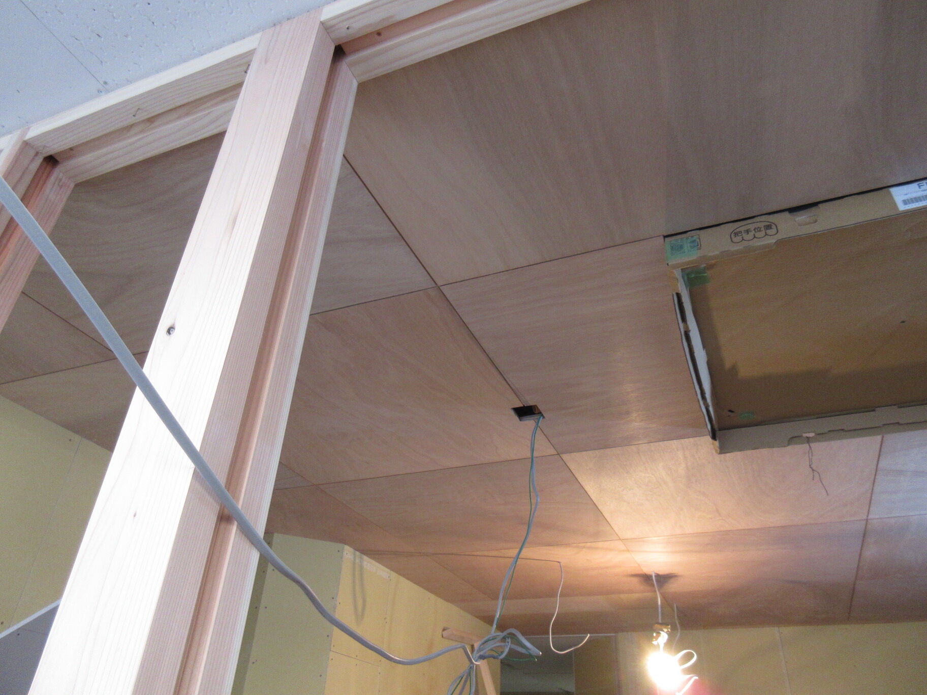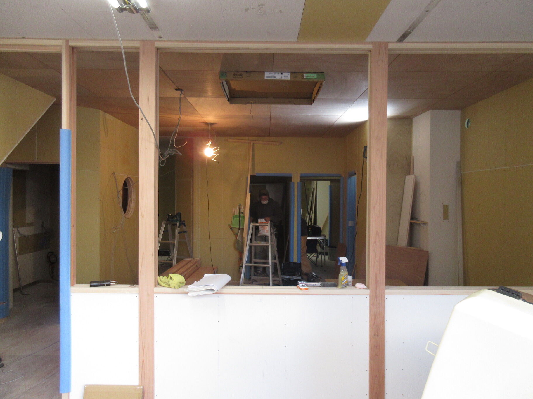 間仕切りの下地はほぼ終わって、棚板・家具の造作やファサード工事の準備が進む段階。待合の天井にはラワン合板を目地を取りながら正方形で張っていい感じ。このままでもいいが結構色を付けた塗装をするので、また印象が違ってくると思われる。