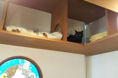 先生自身が飼われているワンちゃんやネコちゃんが既に住み着いている。心配したキャットウォークには黒くてきれいな1匹のネコちゃんが、居心地良さそうにカウンター上を陣取っていた。一安心というところだが、これからやって来るたくさんのワンちゃんネコちゃんとはうまくやっていけるだろうか。目が合ったらどうなるのか、ちょっと楽しみでもある。