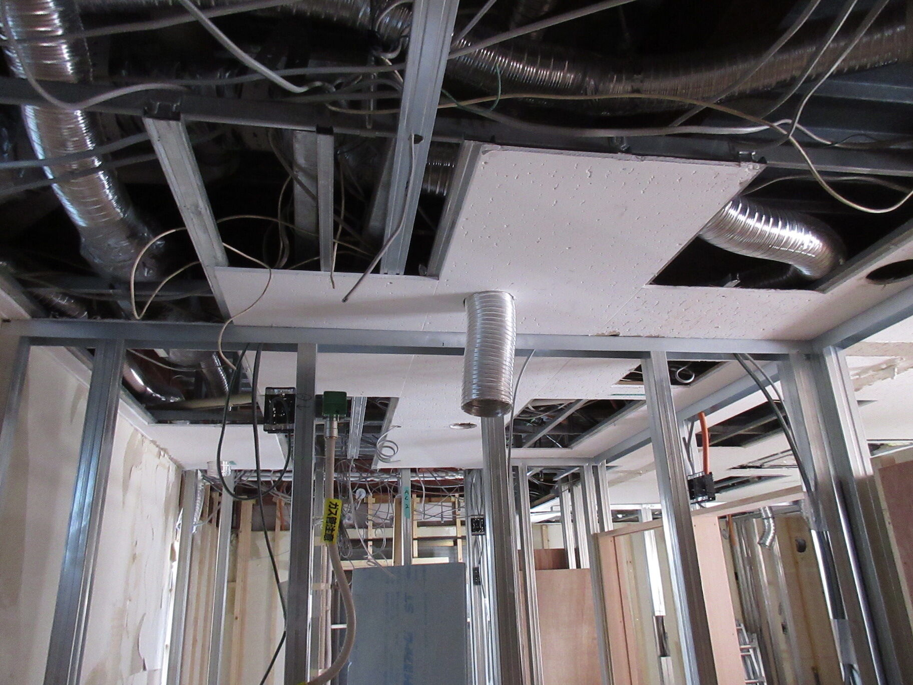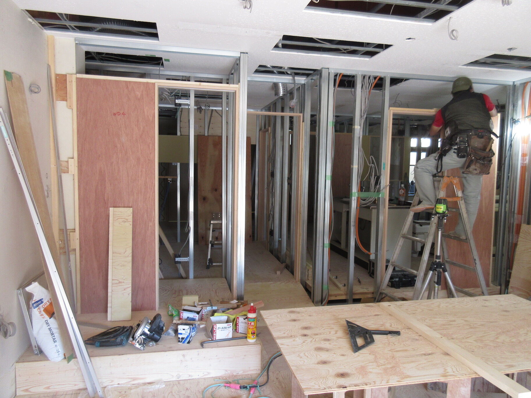 間仕切りの下地が立ち上がり床の下地がほぼ終わった。設備関係の配管配線もほぼ終わり、これから建具枠や仕上げのためのボード張りが始まるところ。そろそろ仕上げの最終決定に向けて色や素材のサンプルを揃えておかなければいけない。