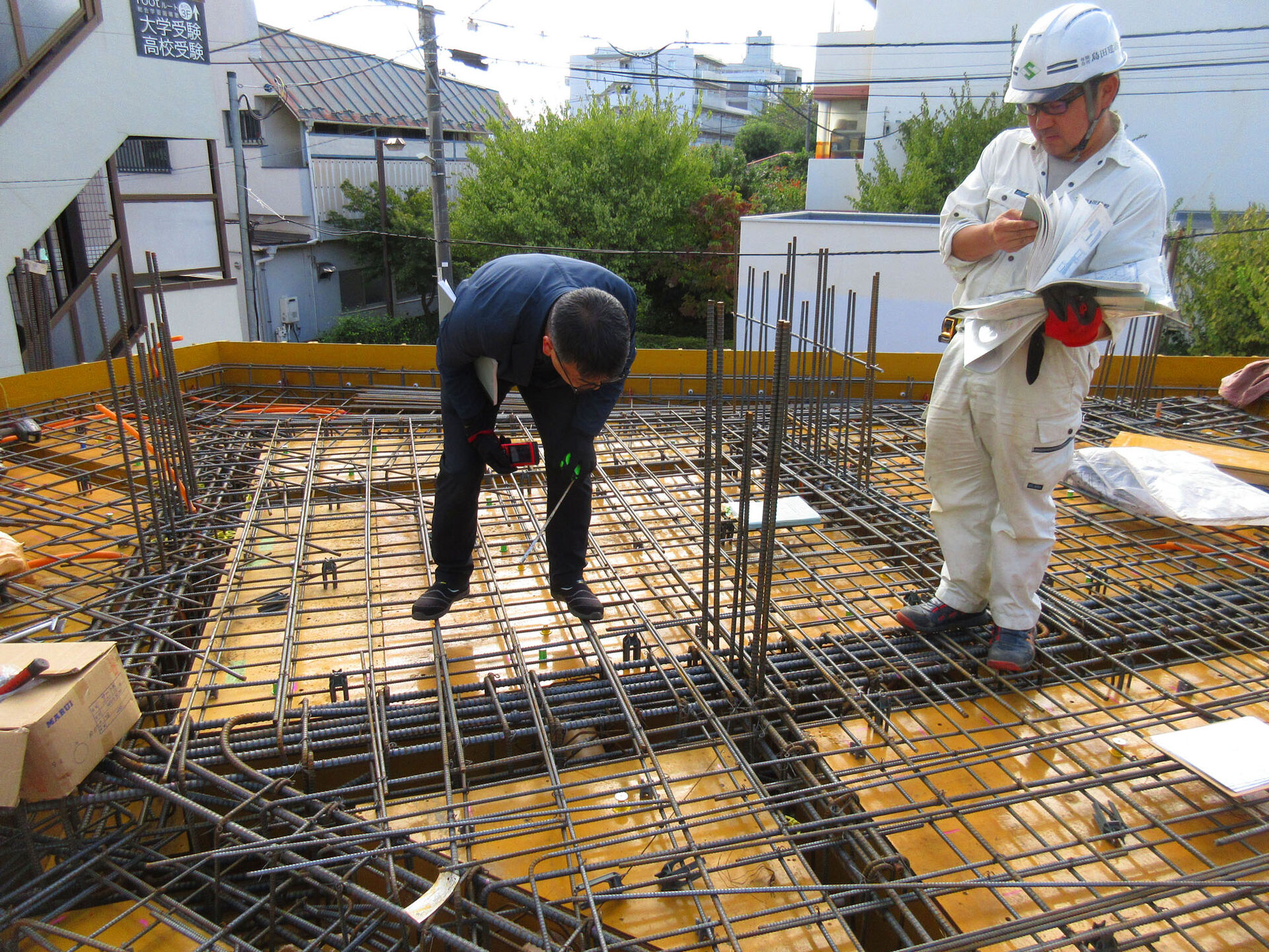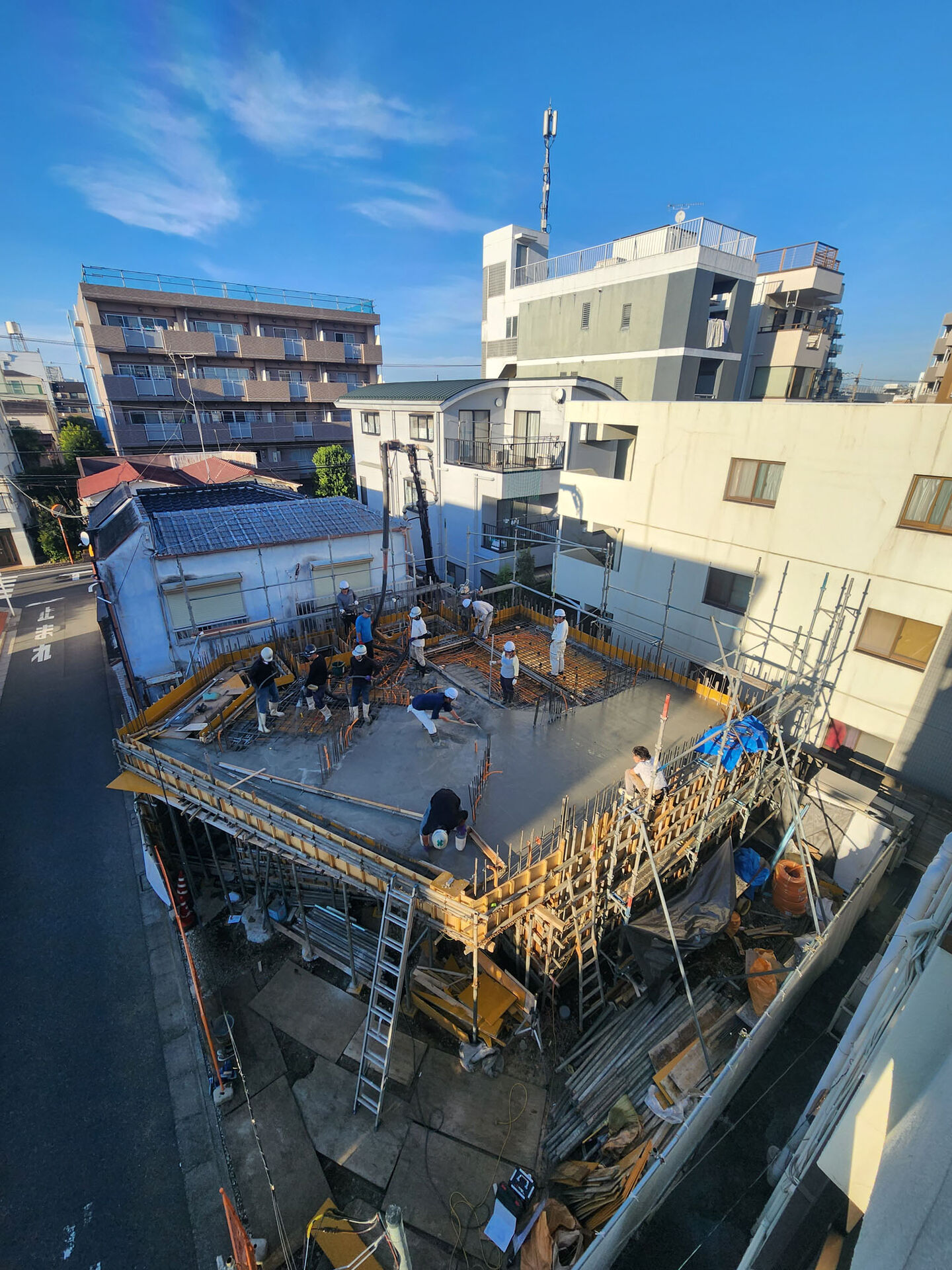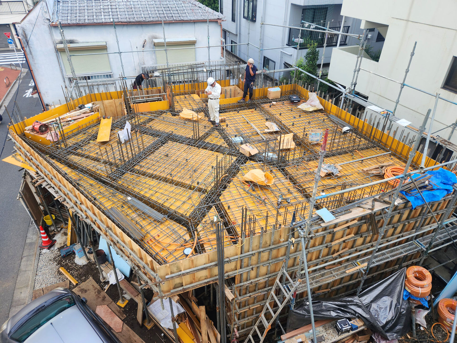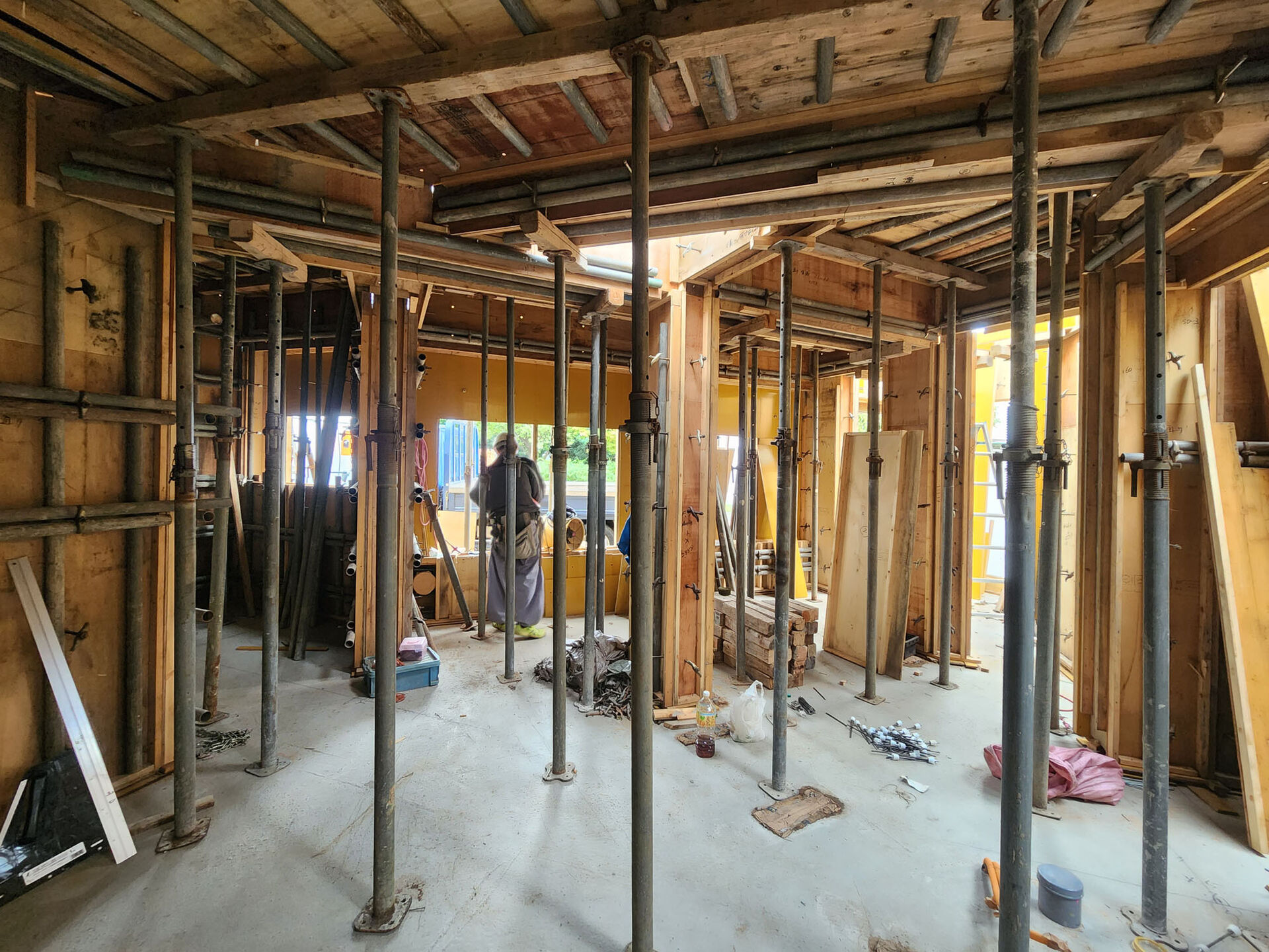型枠を組み立てては鉄筋を並べるという順番で、コンクリートを流し込むための壁が立ち上がりその上には床が組み上がる。構造設計者との配筋検査が各工程で行われ、先日は検査機関による中間検査も問題なく合格した。いよいよ1階のボリュームが全貌を現し、打放しコンクリート打設へ。