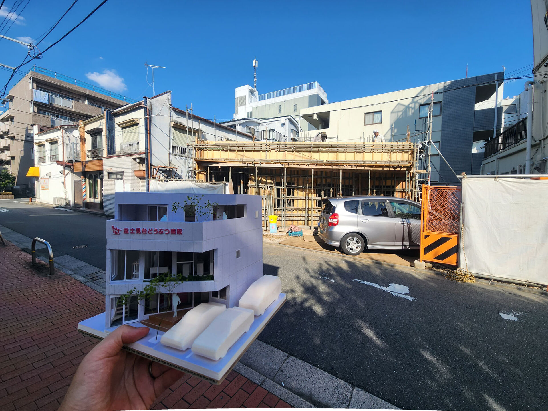 打放しなのできれいに打設されていることを願うのはもちろんだが、Pコンの位置などにもかなり気を使う。想定していたところ以外でも現場でどうしても必要と言われた箇所があって、どう処理しようか模型を持ち込んで頭を悩ませたりもした。今回は特に道路側から見たときの仕上がりを丁寧にチェックしていきたい。さあ次は2階だ。