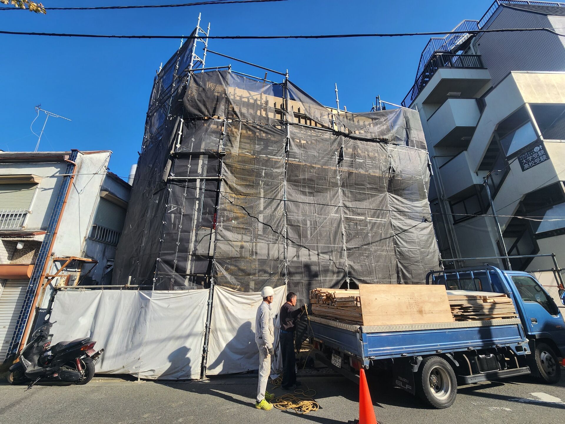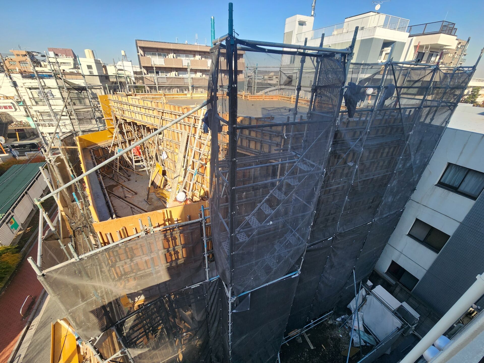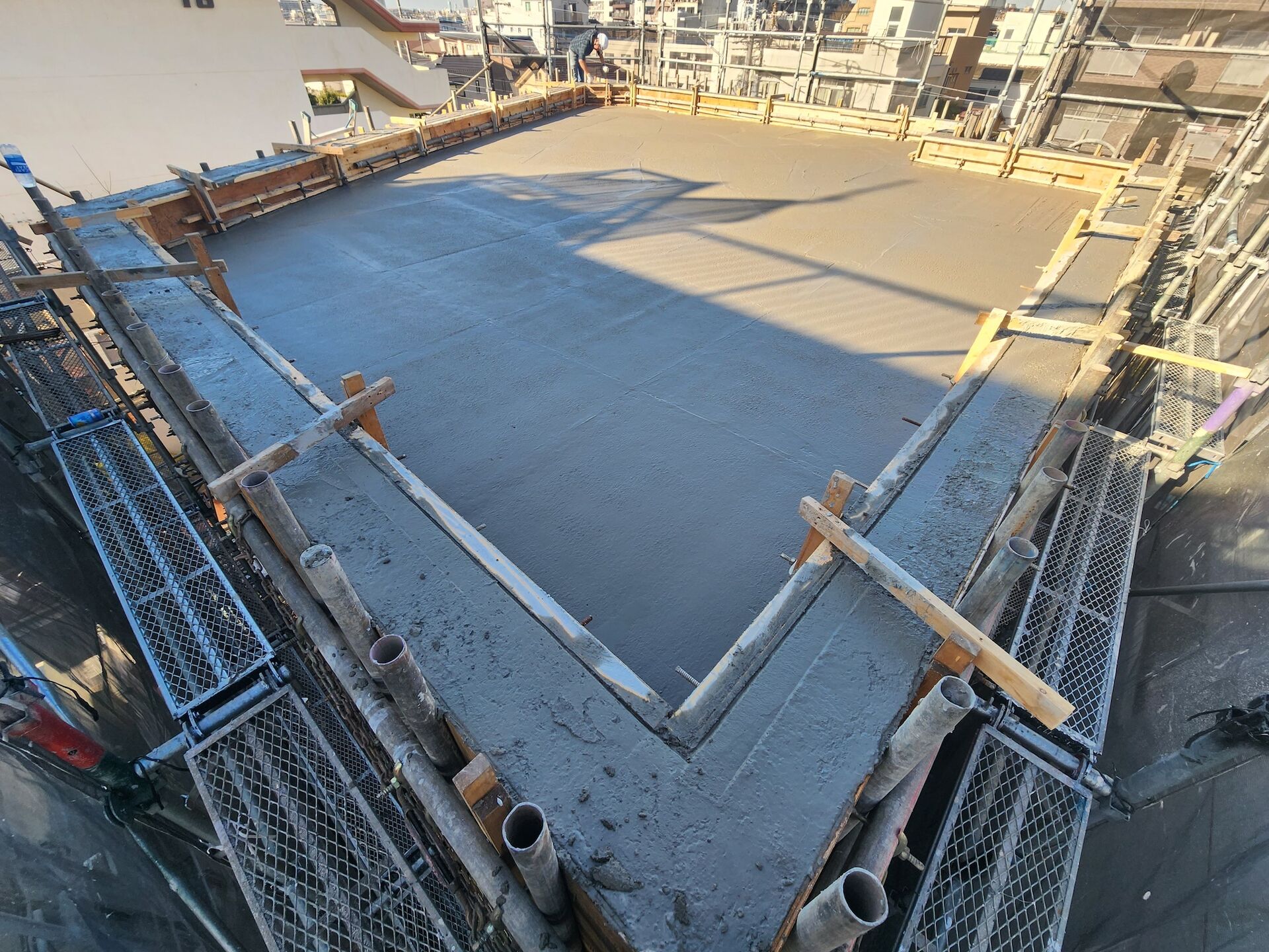 12月頭には3階と屋根のコンクリート打設が行われ、躯体工事は無事終了した。コンクリート工事の間に暑かった夏から一気に肌寒い冬へと季節が変わり、いよいよ年の瀬が迫っている。予定よりも工程に遅れが出てしまったが、これからの内装や仕上工事で挽回するべく、前倒しの手配や決定が必要になってくる。