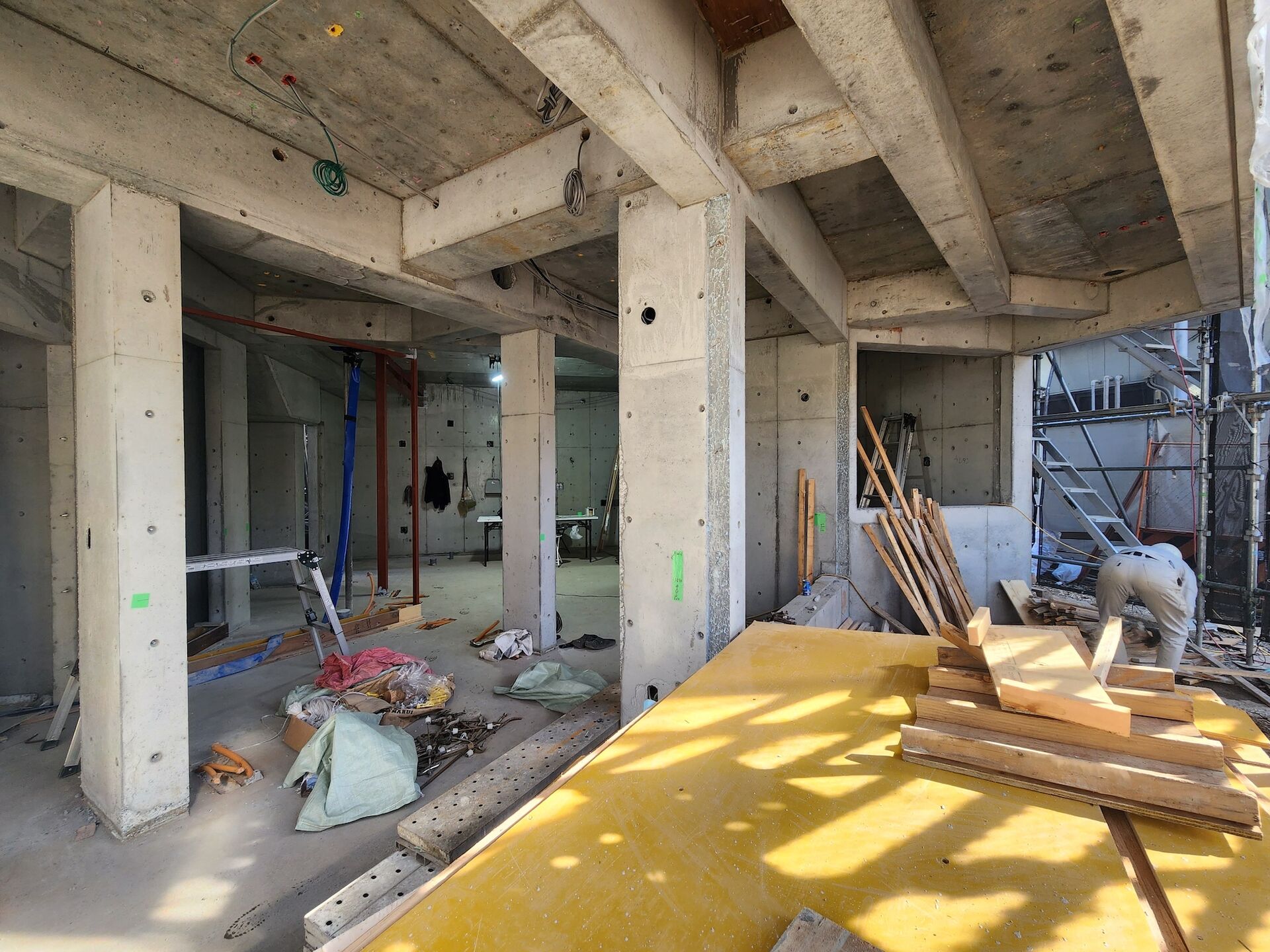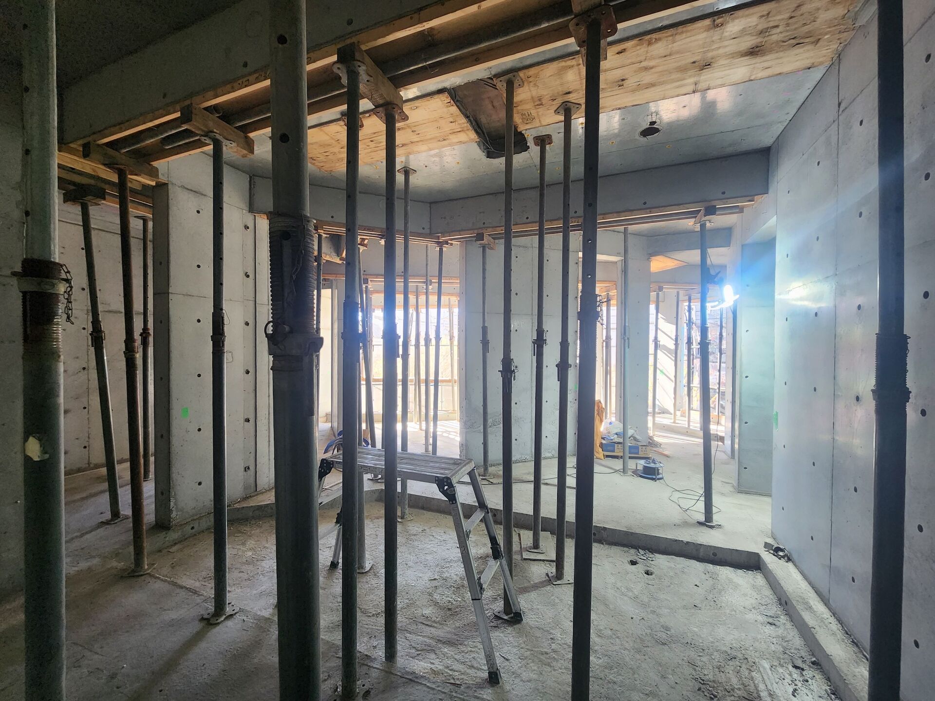 強度が確保できた下階から型枠のばらしが進み、コンクリートがあらわになってきた。所々で小さなジャンカがあるものの、概ね打設状態は良好で一安心。補修が必要なところと、少し荒くても手を入れないでそのまま見せるところの判断が必要になってくるだろう。あまりにきれいに補修しすぎたコンクリートの仕上げは不自然で却って気持ち悪いので、そのあたりのさじ加減が重要だ。