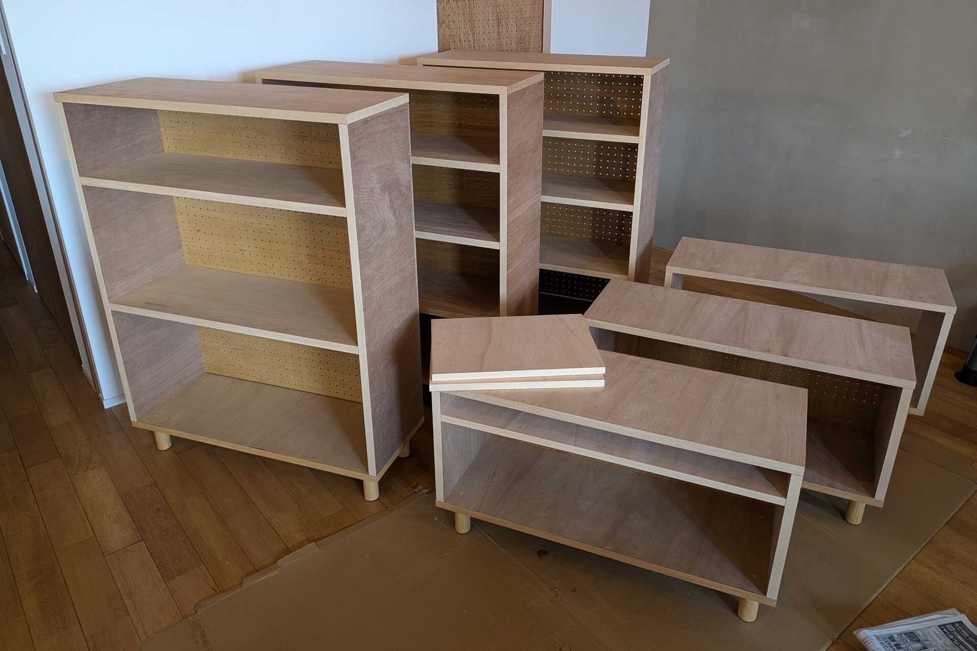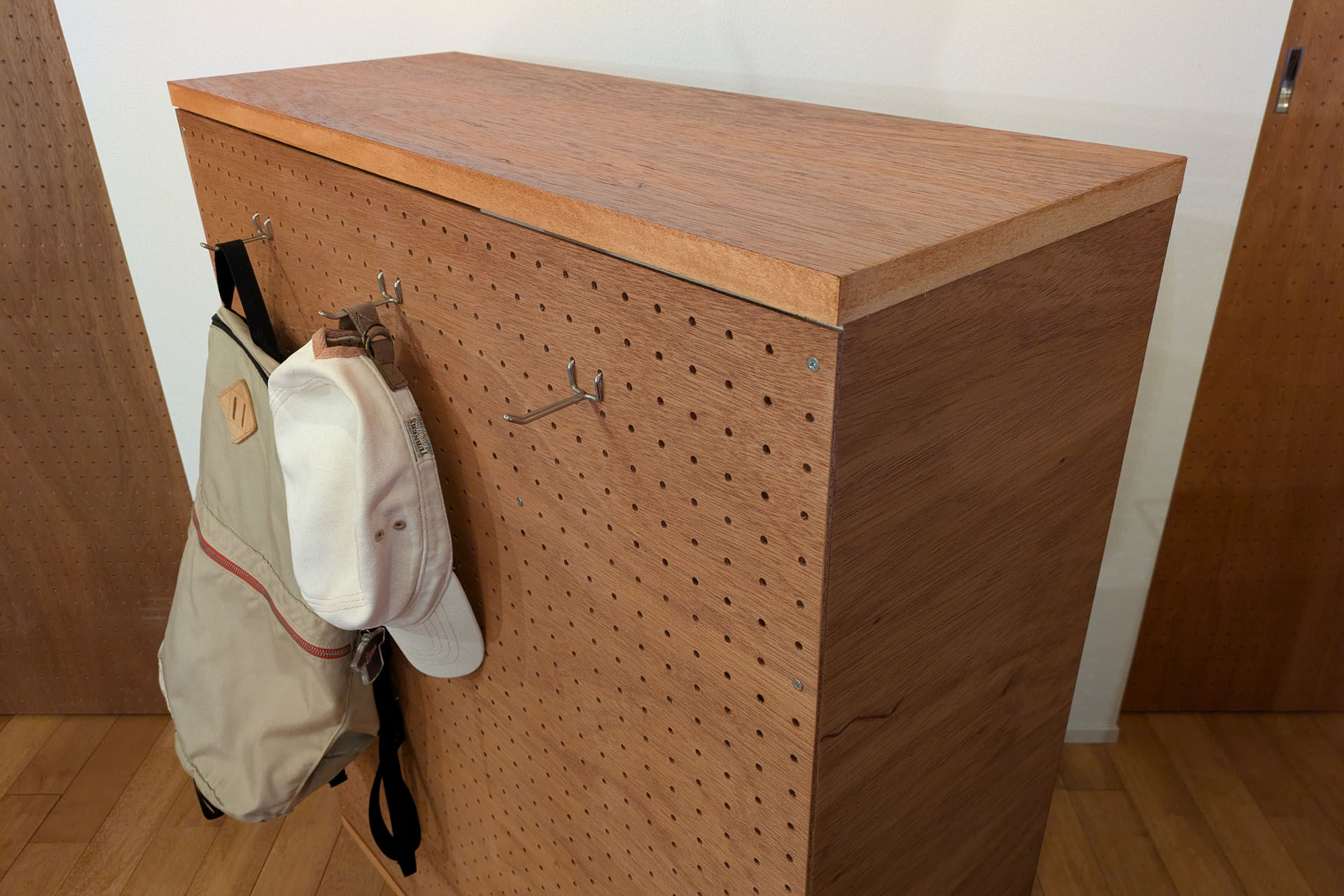 今回の目的はダンボールに入ったままロフトに避難している本やマンガを収納し見せるための家具だ。組み立て方はダボがメインで差し込む際にも接着剤は一切使わず、変更や解体が容易にできるようにしている。縦材と横材を接着剤なしでダボで繋いでも歪んでグラつくので、背板として有孔(穴あき)のラワンベニヤを貼り付けて面剛性を確保している。有孔のラワンベニヤは建具でも使っているが、空気を通す機能性と穴にフックを付けて色々なものを引っ掛けられる利便性が気に入って最近特に多用している。直径5mmの穴がビス止めするための穴としてちょうどよくて、ビスの存在をカモフラージュしてくれる。
