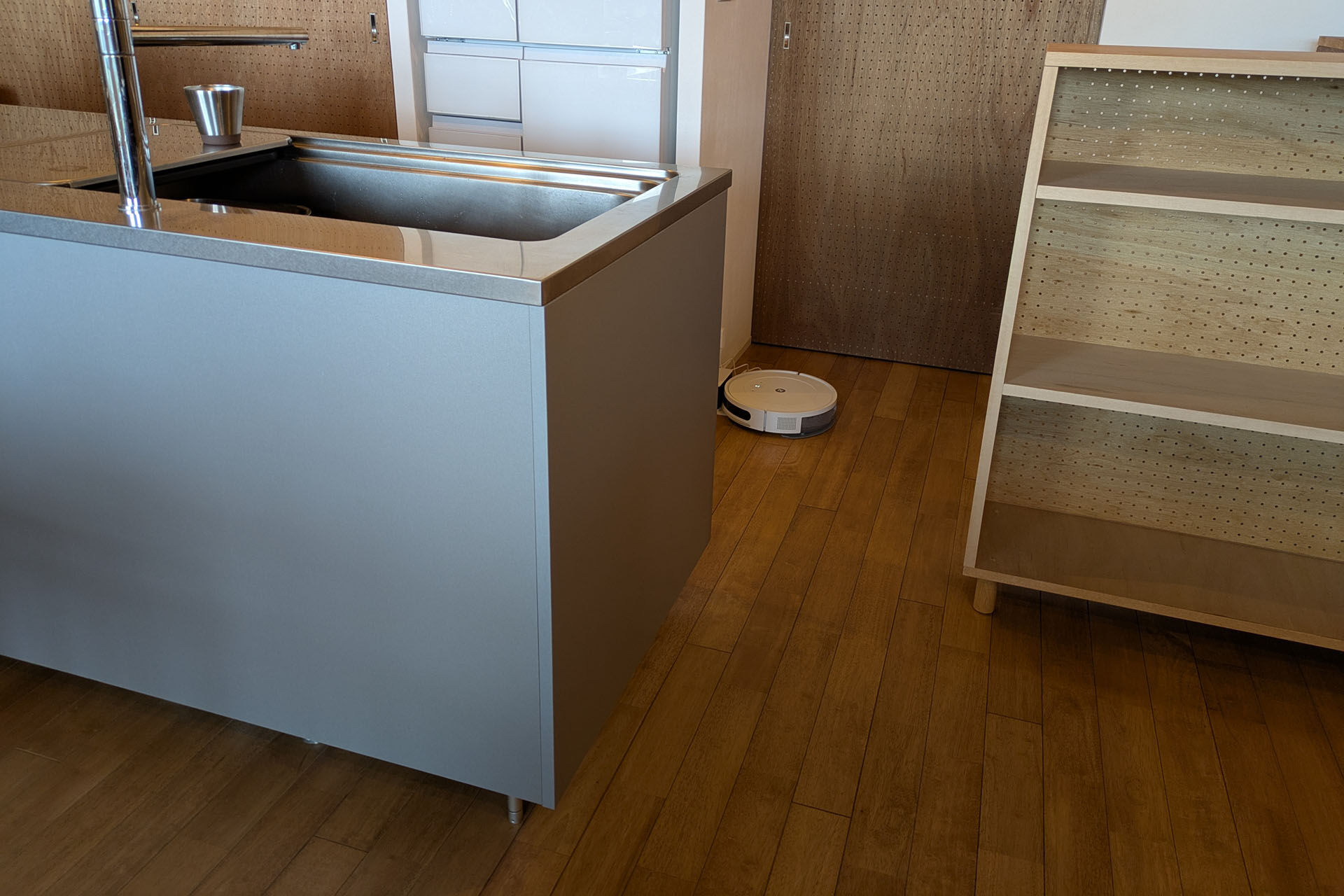 それぞれの家具は40φの丸棒で4隅に脚をつくり約100mm浮かしている。これはLDKに鎮座するアイランドキッチンが100mm浮いていることに倣ったものだが、もう一つ大きな目的がある。それはルンバが通れる隙間をつくるということ。以前設計した住宅でお客さんから同じ条件をもらったこともあって、その時はルンバで決まる設計への抵抗があったものだが、今回は軽快なデザインということも相まってむしろ積極的な採用となった。