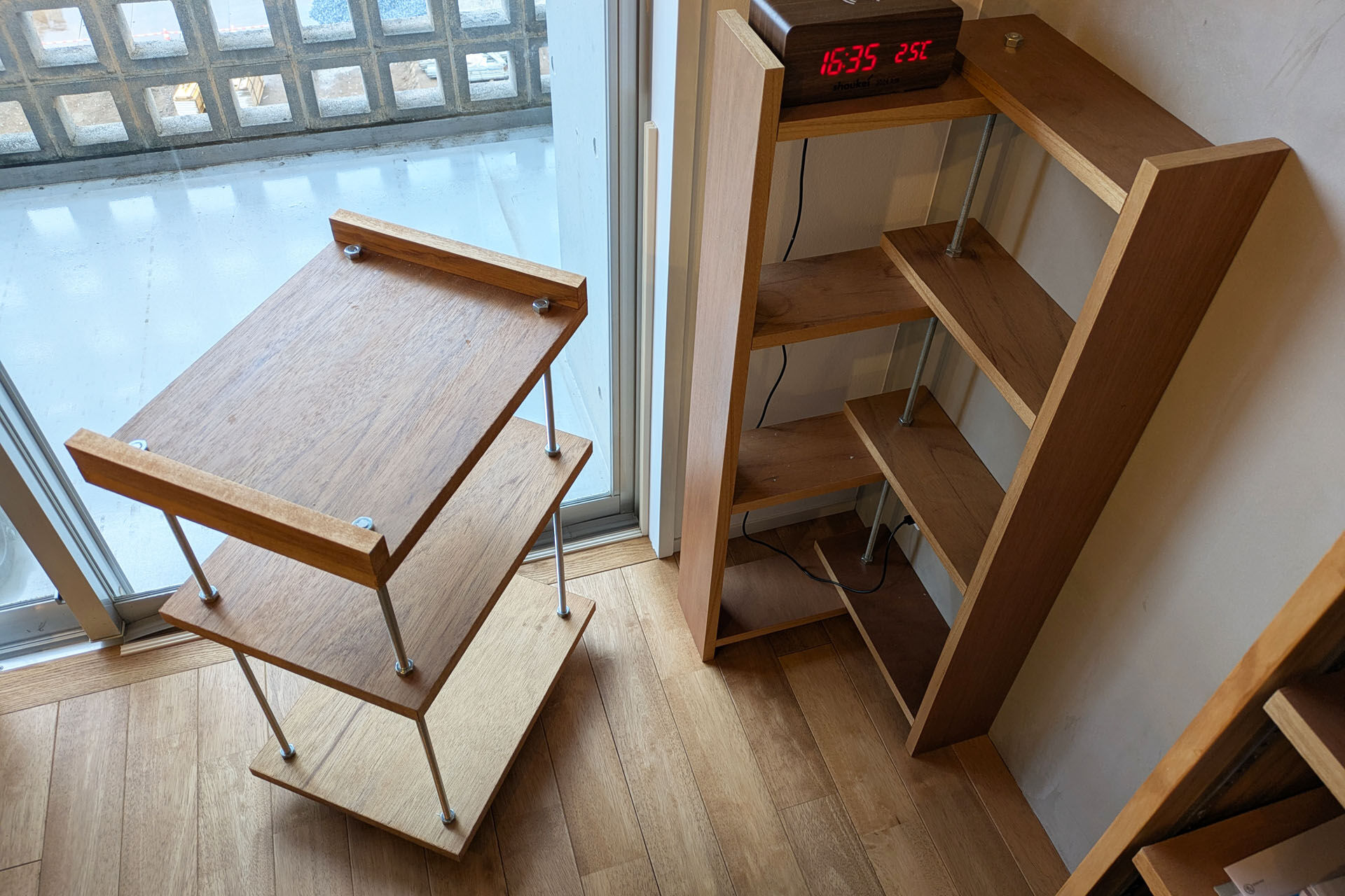 学生の頃はデザイン的に凝ったり色をつけたものも作ったが、最近はもっぱらラワンのランバー合板を基材としてオイル塗装で仕上げるものに落ち着いてきた。自宅内装の天井や建具で使っている材料もラワンだし、フローリングとも見た目の相性がよい。さらには費用的に最も安価な材料なのと、シナとかに比べて木目がきつくロットによって色目にバラツキがあるのもむしろ気に入っている。