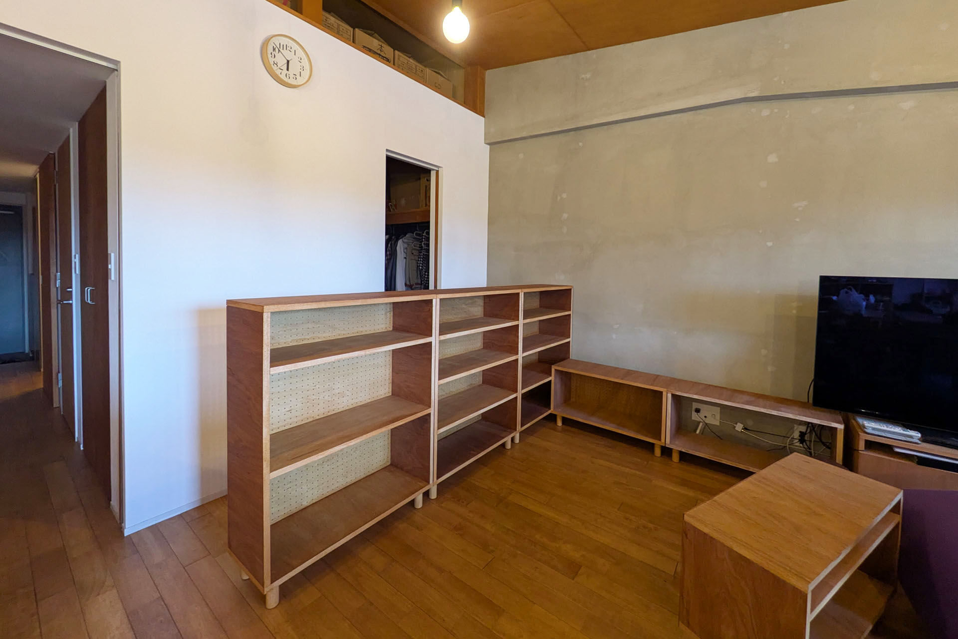 本棚は横長のリビングスペースを仕切るものとして想定していたが、なんと家族からは狭くなると評判が悪い。幸い簡単に動かせるので色々と試行錯誤してみようと思う。兎にも角にも、ようやく一段落といったところ。