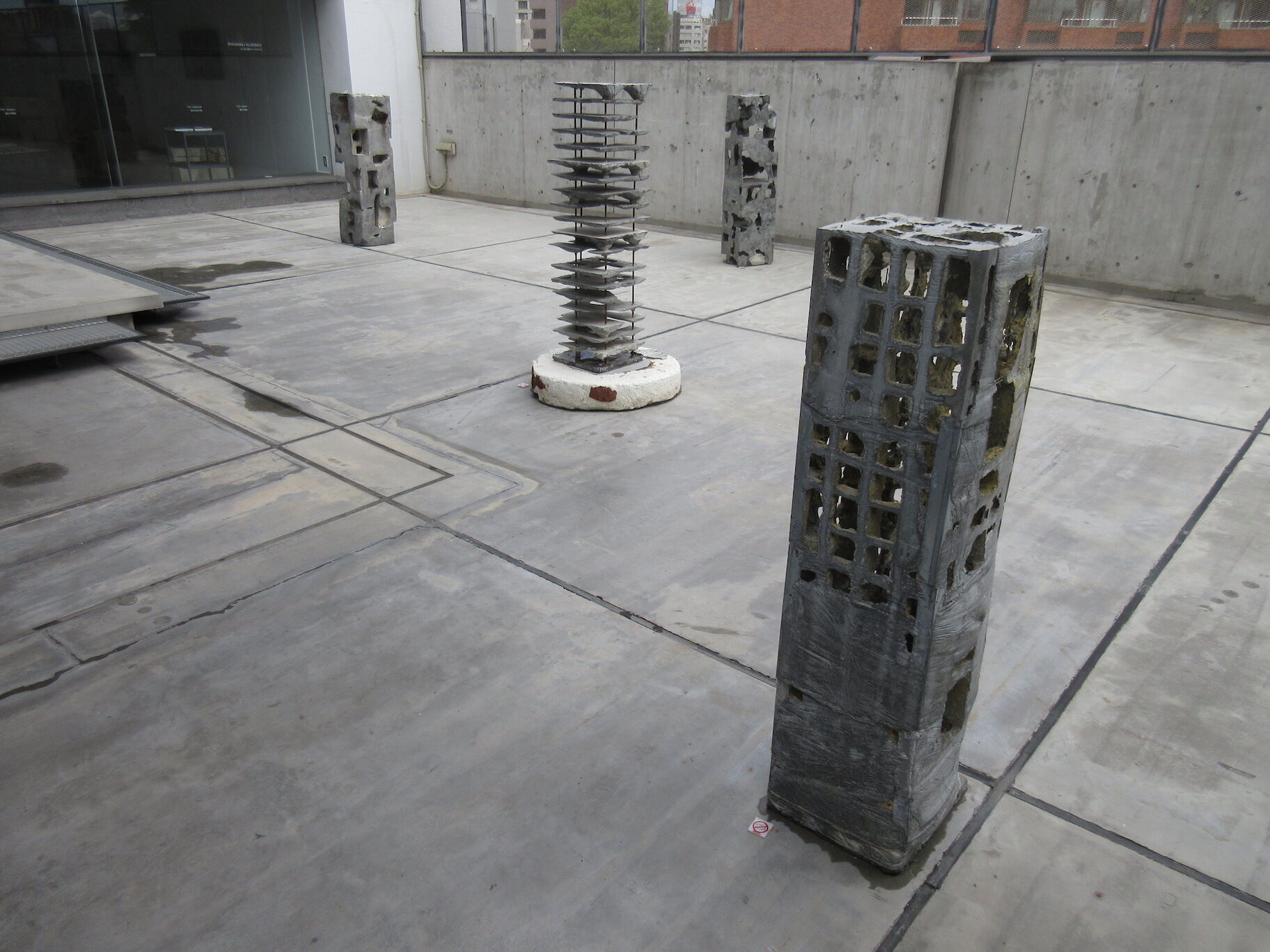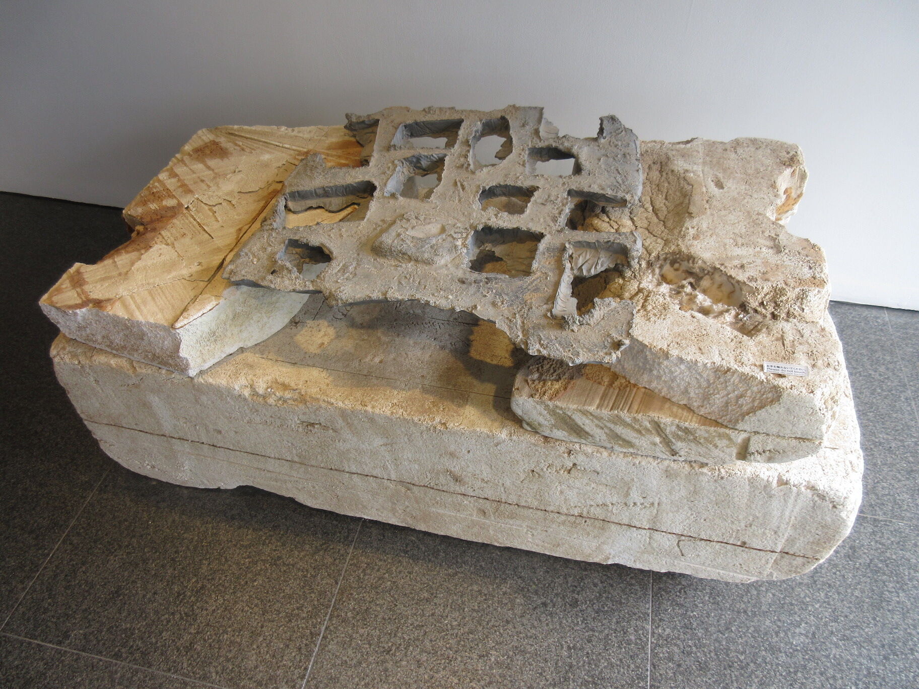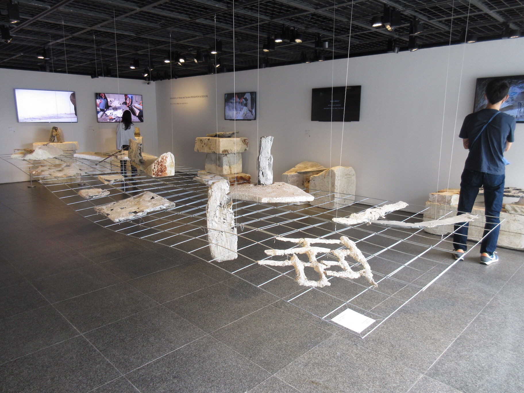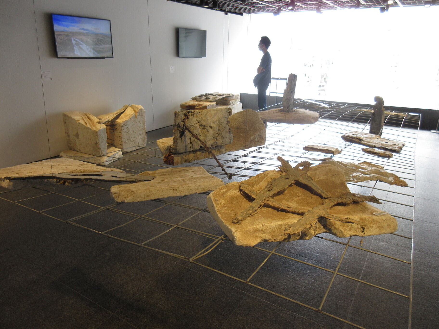 会場に入るとなにやら廃材のようなカタマリが、中央にバラバラと浮いていたり荒々しい石台(実は発泡スチロール)の上に置かれたりと、およそ建築の展覧会でイメージする写真や模型、ましてや図面の類いはどこにも見られなくてたじろぐ。その鈍い色のカタマリはスタディ模型やイメージ模型のようなものかと想像したが、各コーナーで流れるモニタを見ていくと工法や素材や形にいたるまで、スケールを飛び越えた建築そのものなのであることが分かってくる。