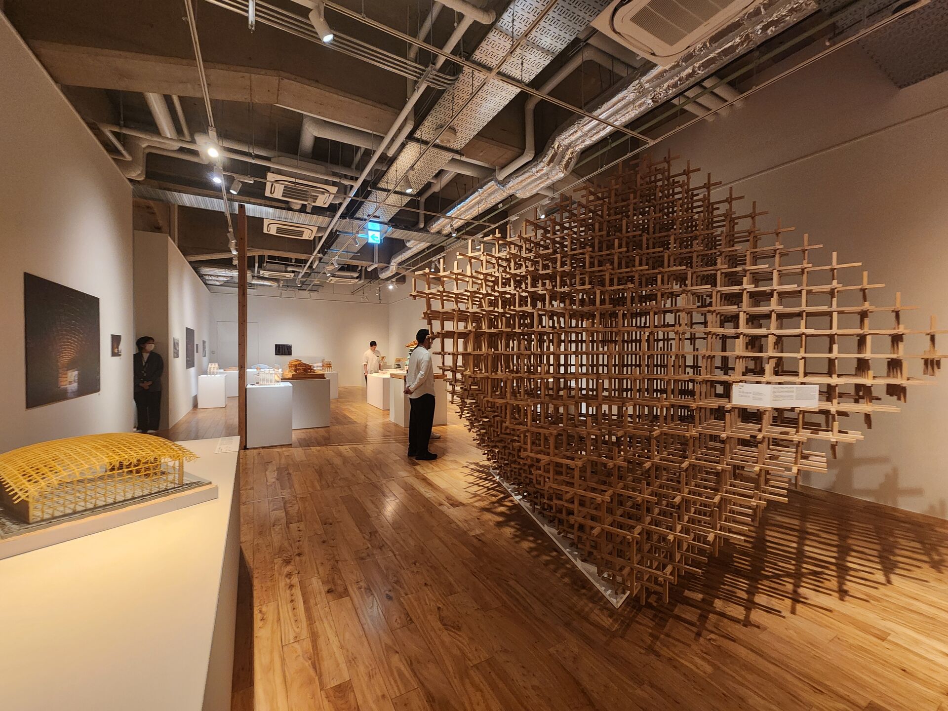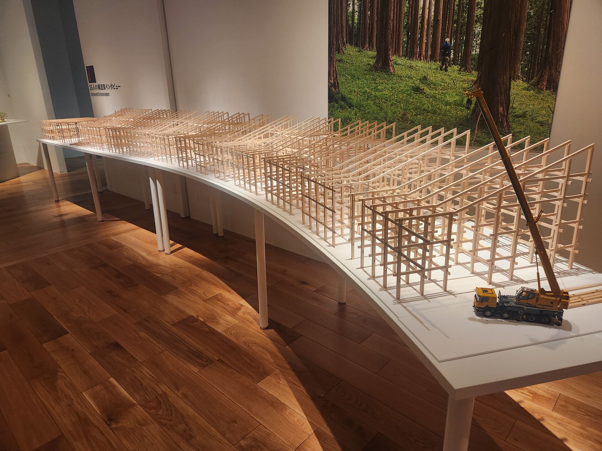 話題となっている大阪万博大屋根リングの一部模型はなかなかタイムリーな展示だった。伝統工法にヒントを得ながら現代技術の金物に工夫をしているわけだが、様々なスケールの模型があることが特徴だろう。ヒューマンスケールで見られる柱・桁の連続が巨大なリングの視点ではなんだか違うものに見えてくる。万博には一概に賛成できないけれども、見に行ってみたいと思わせるものだった。