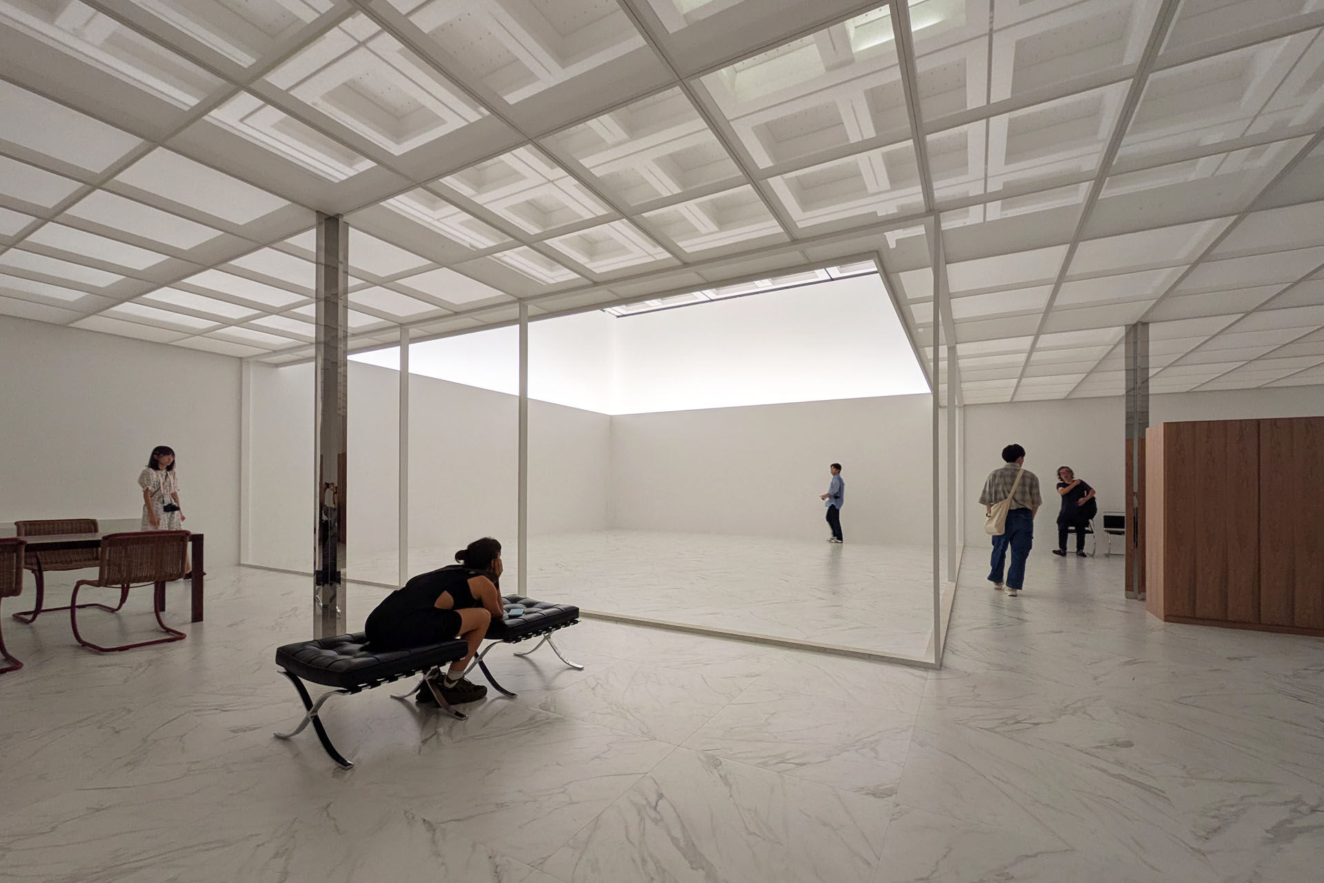 上階の企画展示室ではミースの未完のプロジェクトが原寸大で再現されて体験できる。ミースの研ぎ澄まされた空間が室内と一体になる中庭に開いており、オープンでミニマムなデザインの良さをより一層引き立たせている。中庭を照らす照明の色が刻々と変化して、時の流れまで感じられる素敵な演出である。
