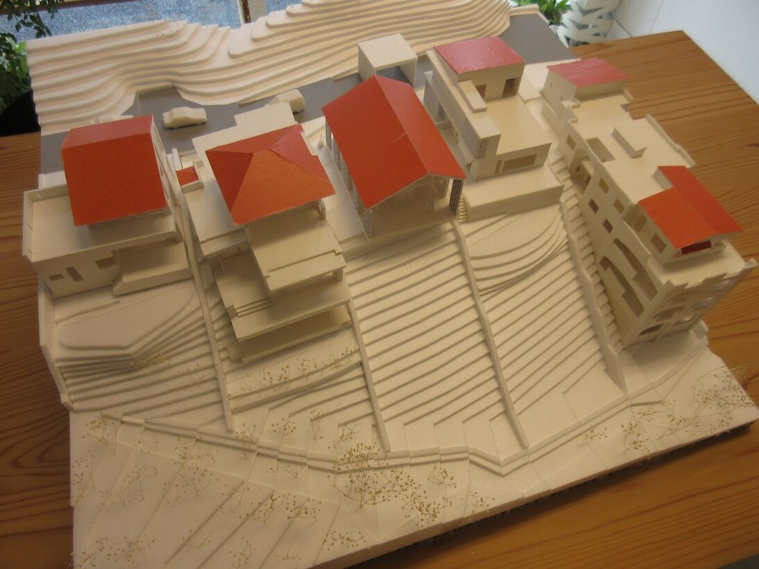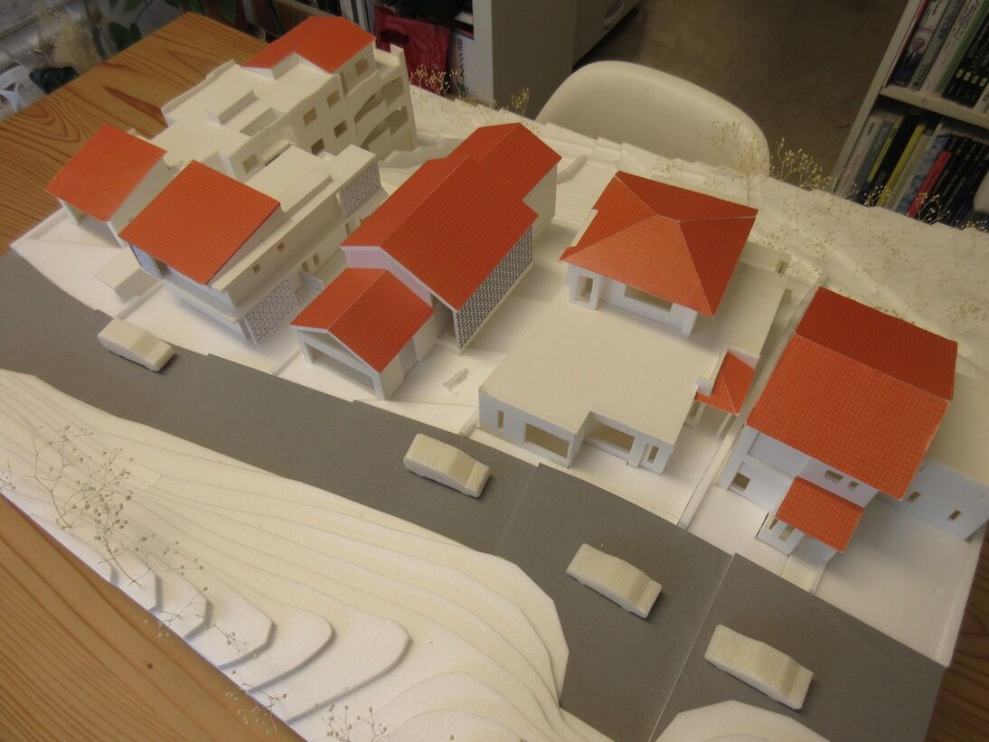 ゆったりのスケジュールで進んでいる沖縄の家。まずもって敷地周辺の模型を作り出したら予想以上に時間と手間が掛かることになった。傾斜地の高低差やそこに埋もれるようにして建つ近隣住戸のつくり込みは、アルバイトの子には手に余る作業だったかもしれない。しかしこれを眺めながら、ああでもないこうでもないと思考をめぐらす過程はどうしても必要なのだ。