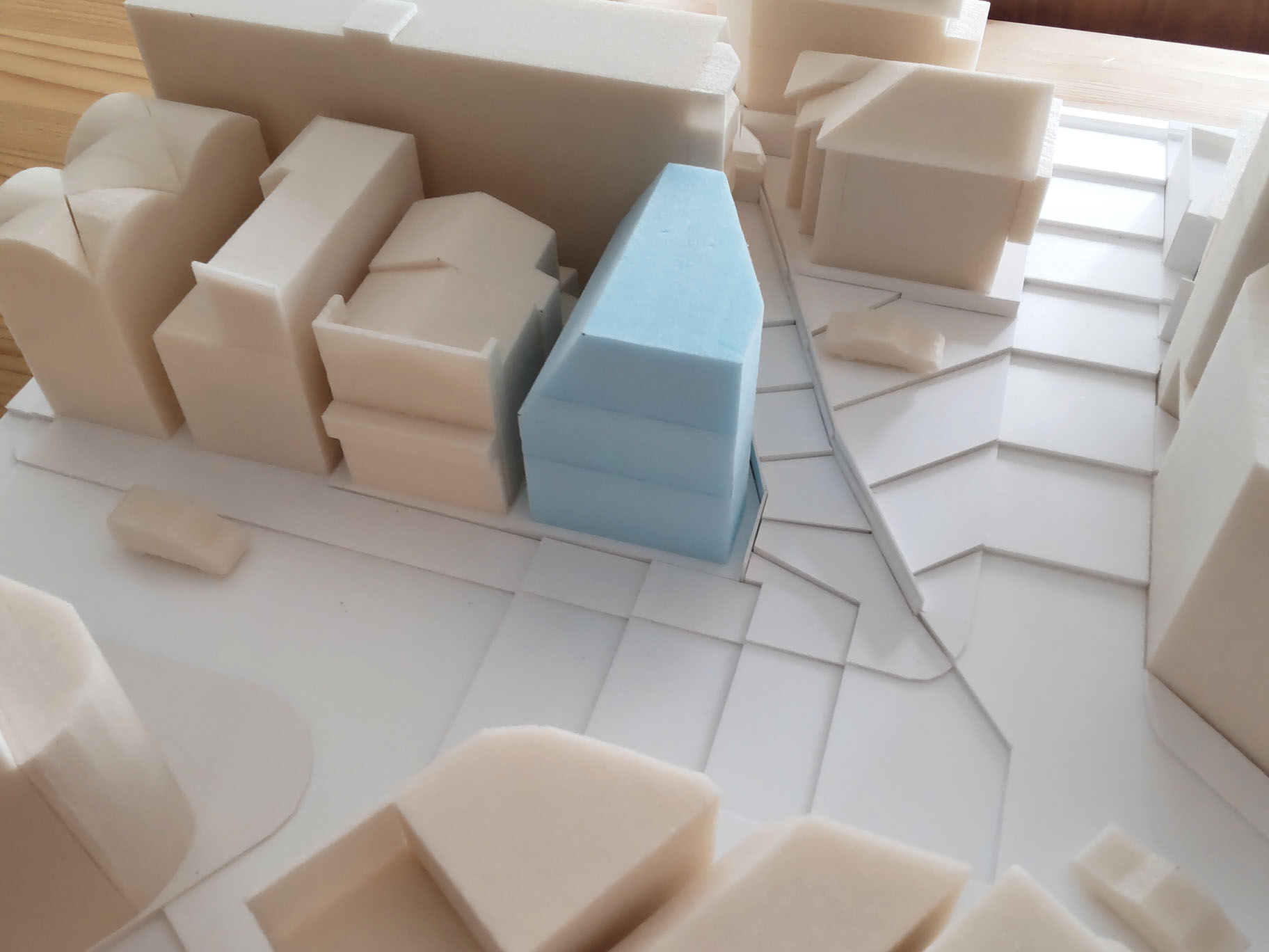 住居専用地域に比べて建坪・容積が緩い分、目一杯建てようとするとどうしても敷地形状や法的規制がそのまま建築の形になりやすい。今回もそのまま要望を整理すると最大容積でのっぺりとしたボリュームが想定されるため、奥行き感やちょっとした凹凸をつくる必要がありそうだ。敷地形状の一辺が斜めの変形敷地なので、そういった要素も利用することでプランに動きを出せる気がする。