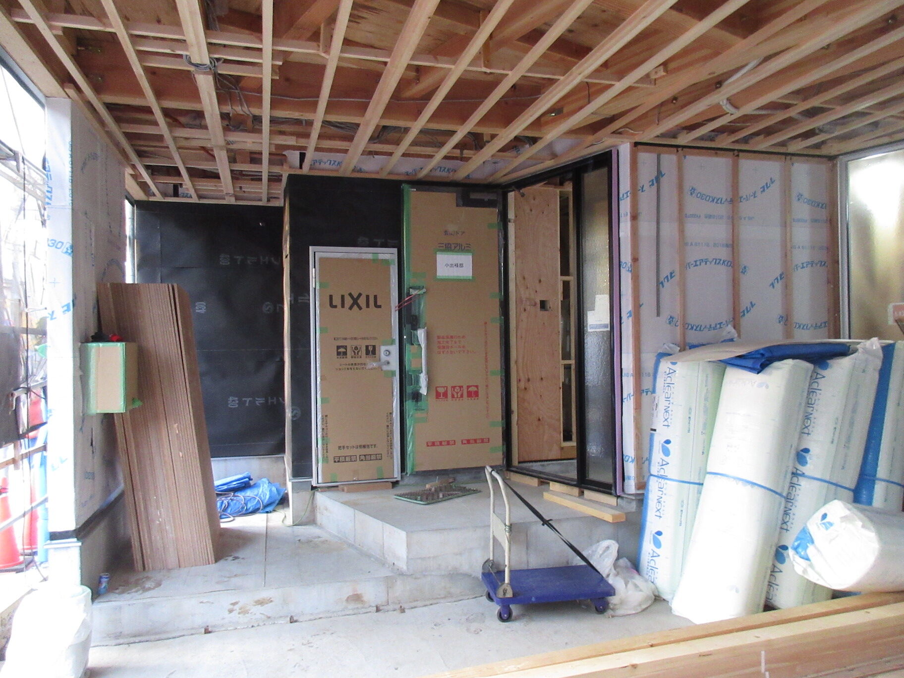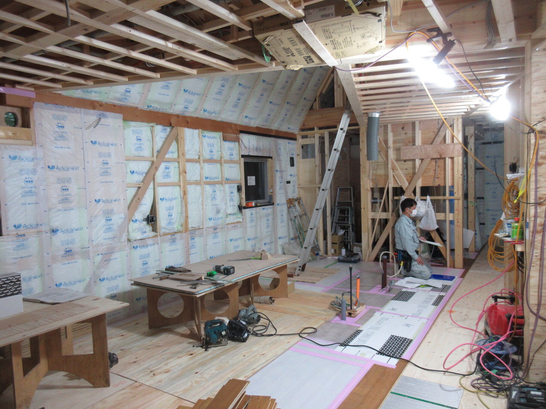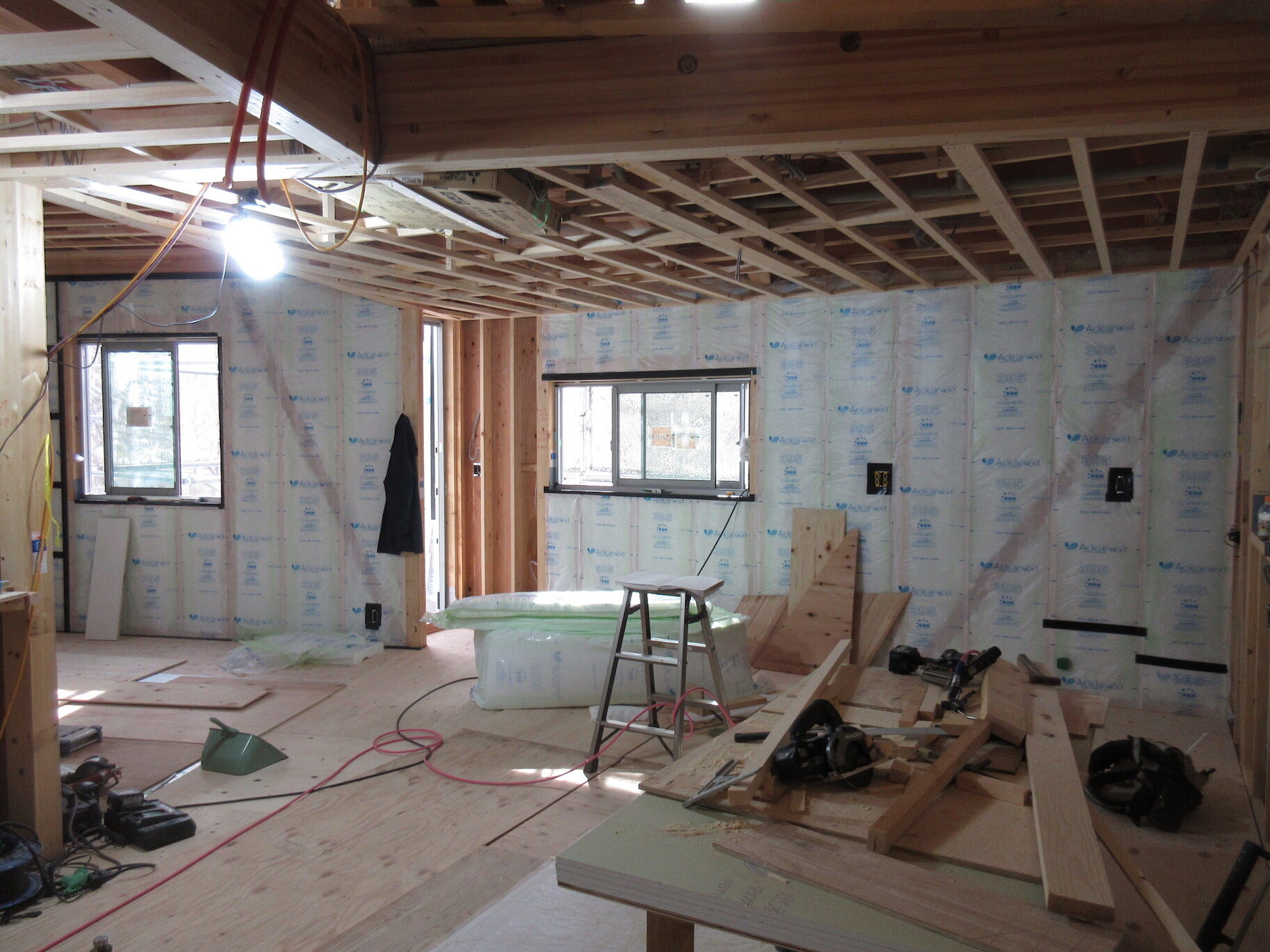 内部は電気・設備関係の隠蔽部分はほぼ終わり、断熱材の工事もほとんど終わって壁や天井を閉じる準備はできている。間仕切りの壁はほぼ設置済みで、建具関係は天井埋込みのレールを先付けするくらいで枠はなくしてスッキリ納める予定。ようやく階段の設置やフローリング張りも始まり、本格的な仕上げ工事に入ってきた。