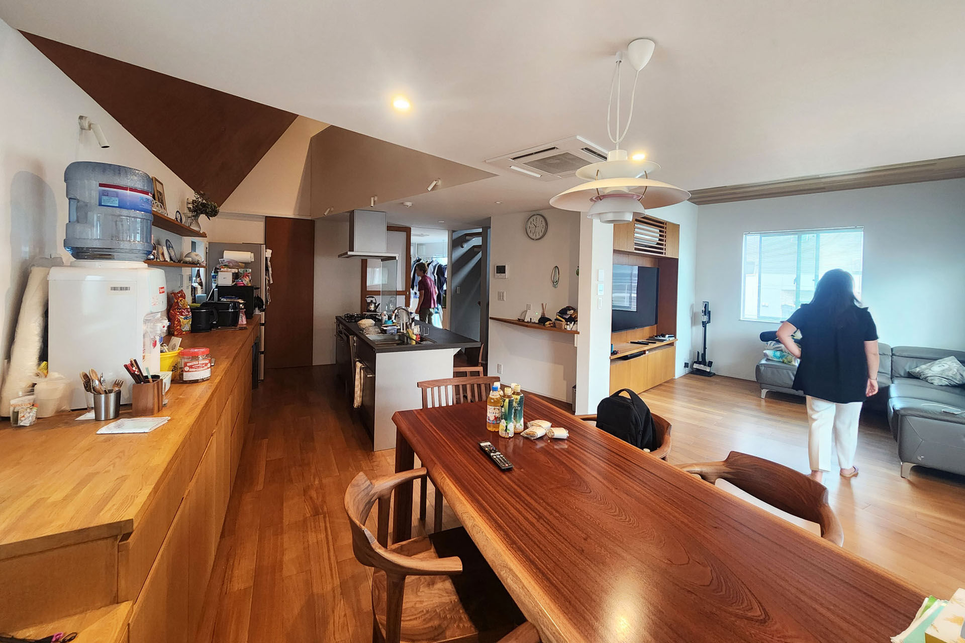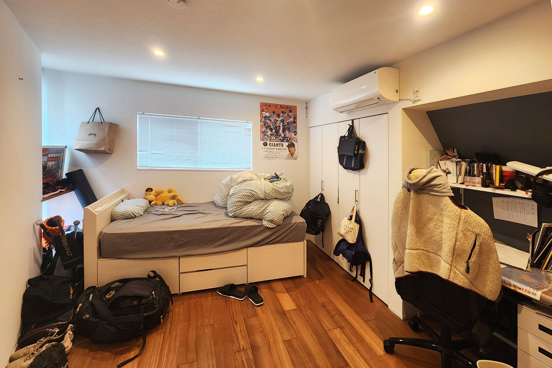 口頭で聞く限りは特段不便はしておらず快適に住まわれているとのことで一安心。掃除などしてくださったからかもしれないがそれほど生活感が出てきているわけでもなく各所整理されている印象。子どもたちの部屋で少しわんぱくぶりが見えたりするのは微笑ましい。床や天井で採用した無垢の材料を当時を振り返り「これにして良かった」と感想をいただくのはとてもうれしいことである。暑さ寒さでは懸念した吹抜もそれほど悪さをせず、2階にある2台のエアコンも1台で事足りているようだ。