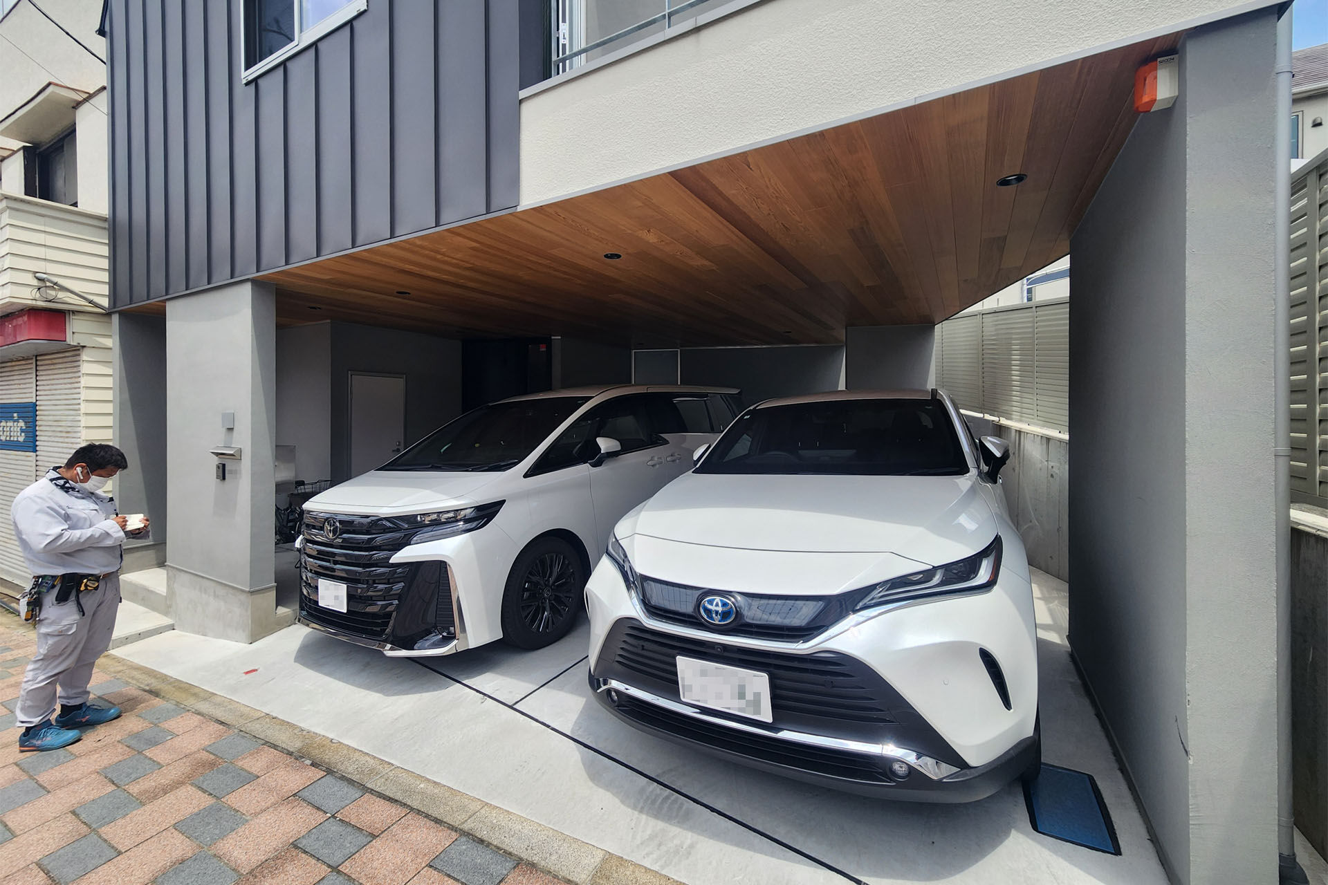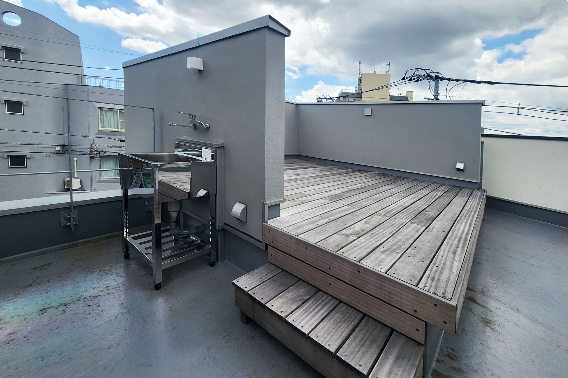 階段周りやリビングの一部で壁クロスの隙間が空いてきたところがあって、この際一度処置することに。変形したボリュームと、間口が広く距離が飛んでいる部材で建物に動きがあることは元々予想できた。しかしこのくらいの隙間で済んでいるならむしろよかった方だと思う。そのような理由である程度覚悟していた外壁の左官仕上部分はほとんどクラックなど発生しておらず良い状態だった。屋上のデッキはやはり過酷な条件下ですでに色褪せてはいるが、味が出ていい感じでなじんでいる。