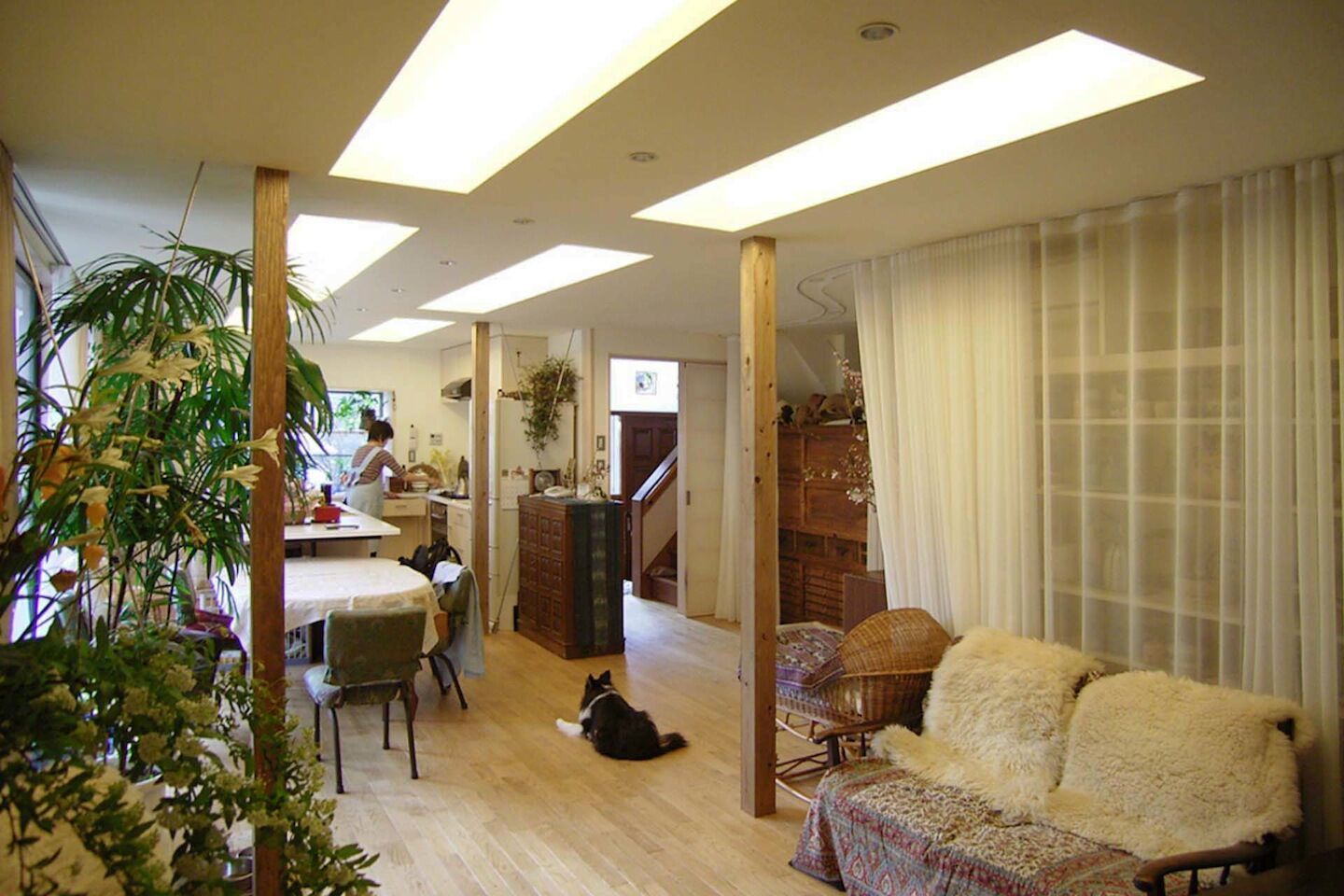 最初は「花小金井の改修」だった。壁面の収納や物置きスペースをレースカーテンで覆って、埃除けの機能性とともに室同士をつないで一体感をつくりだした。カーテンは二重になっているので、所々で透明度の調整も可能だ。