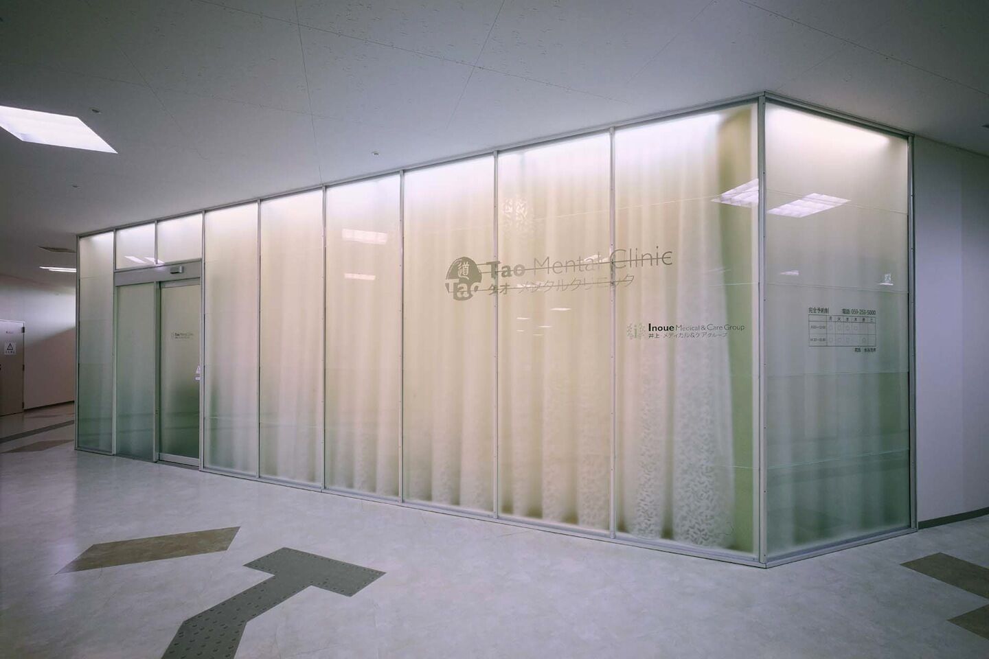 「タオメンタルクリニック」ではファサードの全面ガラス内側に模様入りのレースカーテンを設置している。開放的でありつつもプライバシーに配慮しているのだが、上部の間接照明の光はレースによって広がり、全体を均一に明るくしている。