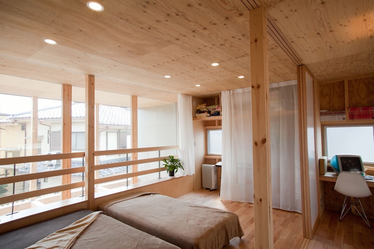 「貫井北町の住宅」では建物両サイドにある奥行き60cmのフトコロ部分にカーテンレールを一本通してレースカーテンを掛けている。カーテンを開けたり閉めたりすることで、ものを隠したり居室とつながったりと様々な関係をつくりだすことができる。