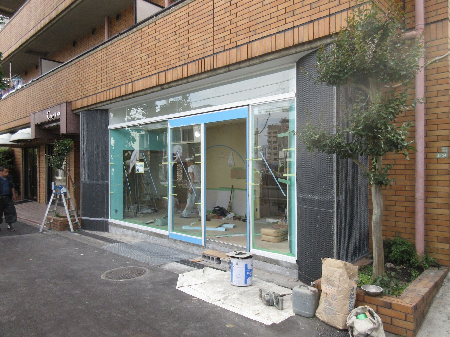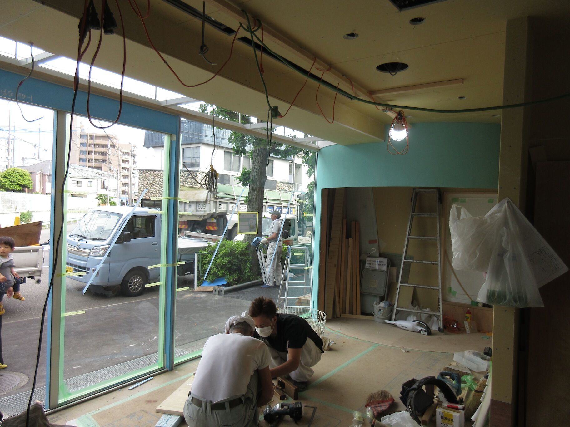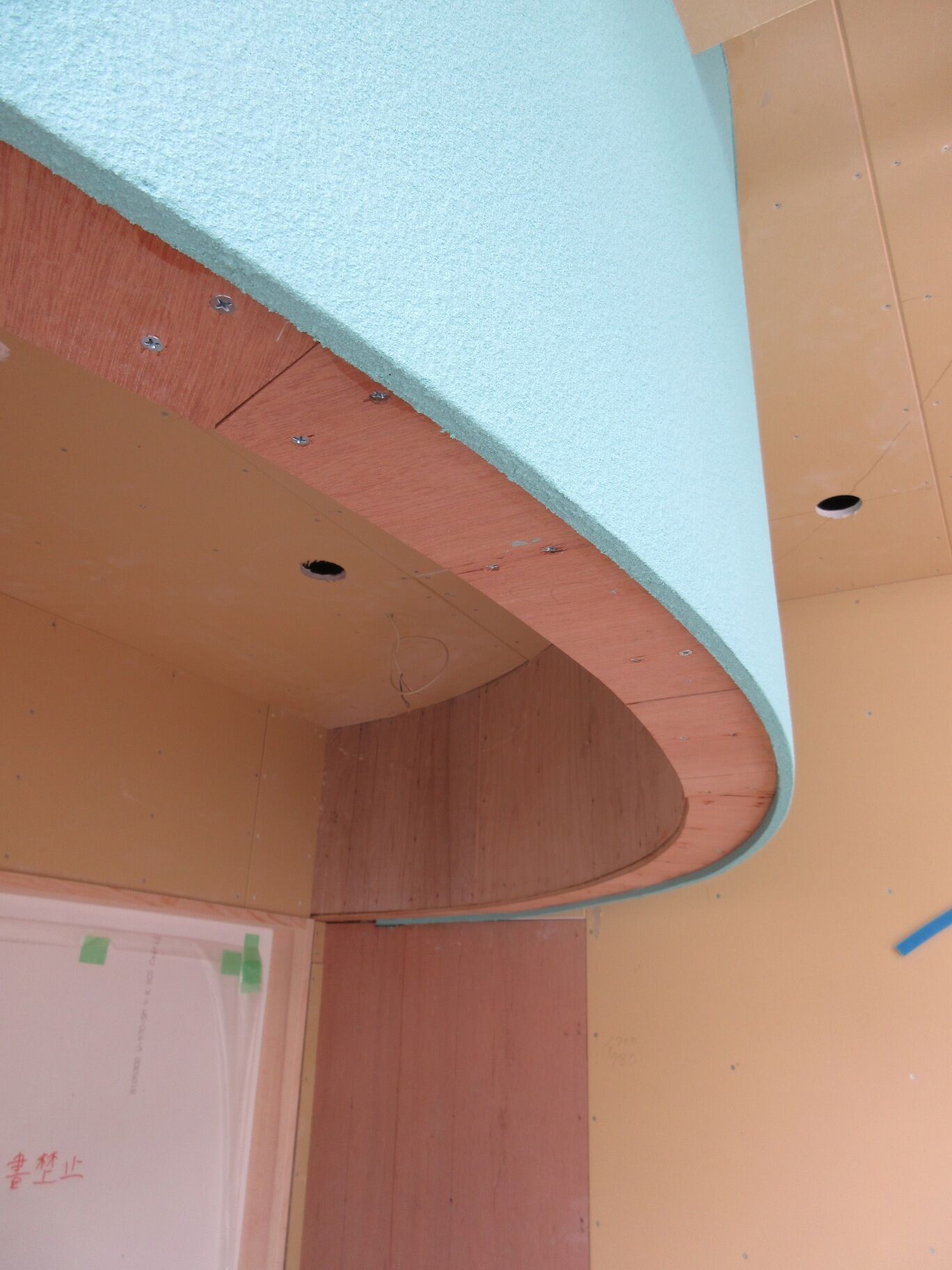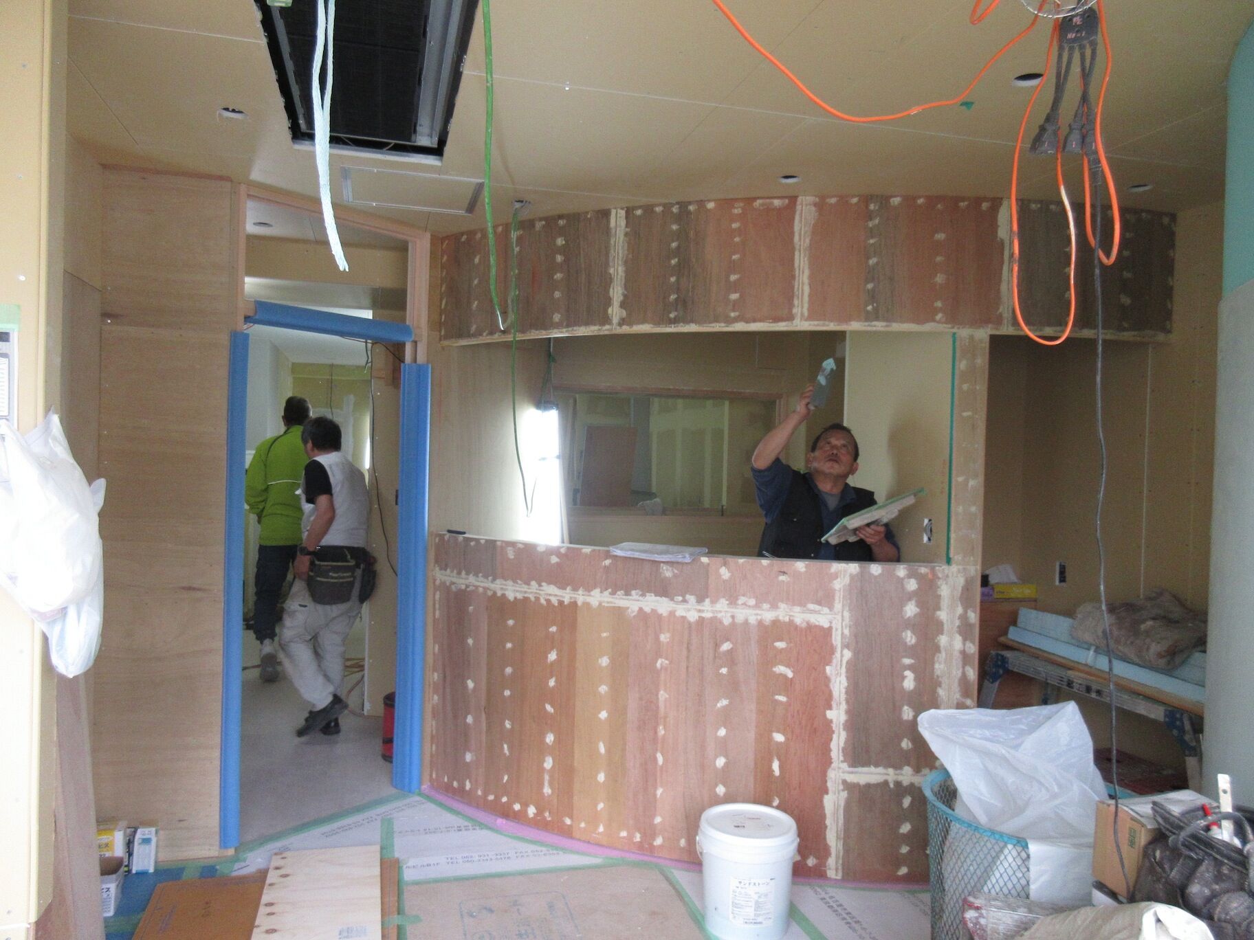 曲面の壁は軽量鉄骨の専用下地があるのでそれほど苦もなく施工できているようだ。木口の納まりをそスッキリさせたくてこだわったので、その辺は苦労しているかもしれない。サッシも存在感をなるべくなくしたくて細かい納まりの指示までしている。実はこのガラス面にどんなロゴやマークが張られることになるのか、把握していないのでちょっと心配・・・。
