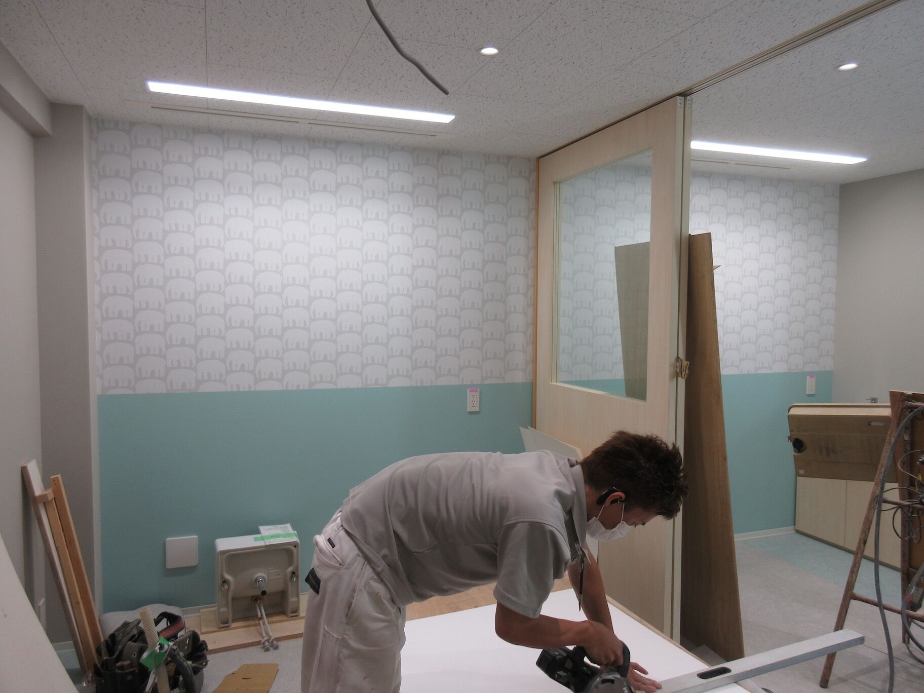 内部では仕上が進んで、カラフルで賑やかな壁紙も貼られている。「ぞうのはな~」という名前の歯科医院にちなんで、ゾウが並んだ壁紙を採用しているところも。もちろん使ったことはなかったけど、北欧のデザイナーによる抽象的なデザイン壁紙でちょっとかわいい。