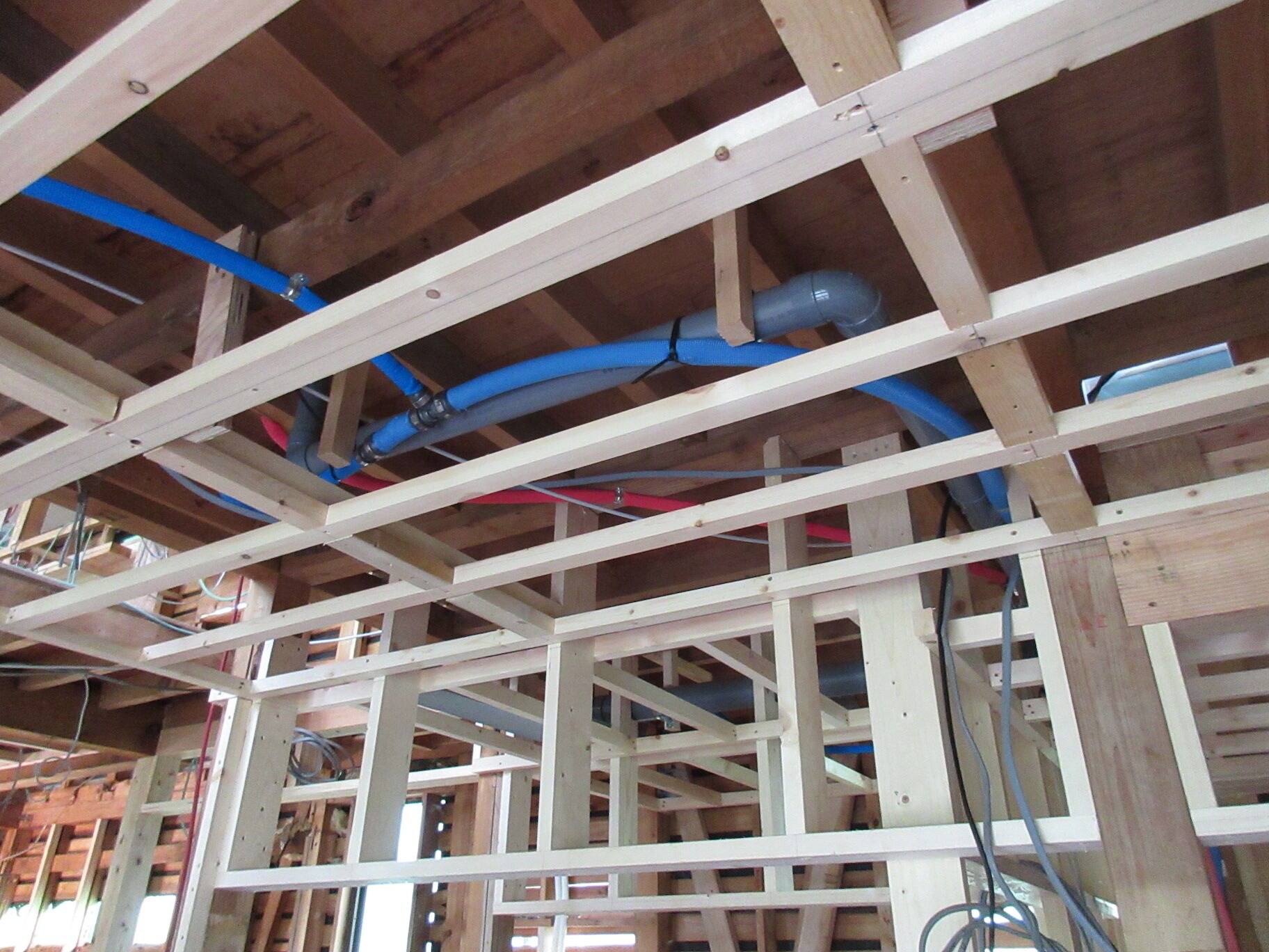 早々に基礎底盤を打設してからは一貫して大工さんの木工事が進む。設備系の配管はほぼ終わって電気関係も下地づくりに併せて配線工事中だ。