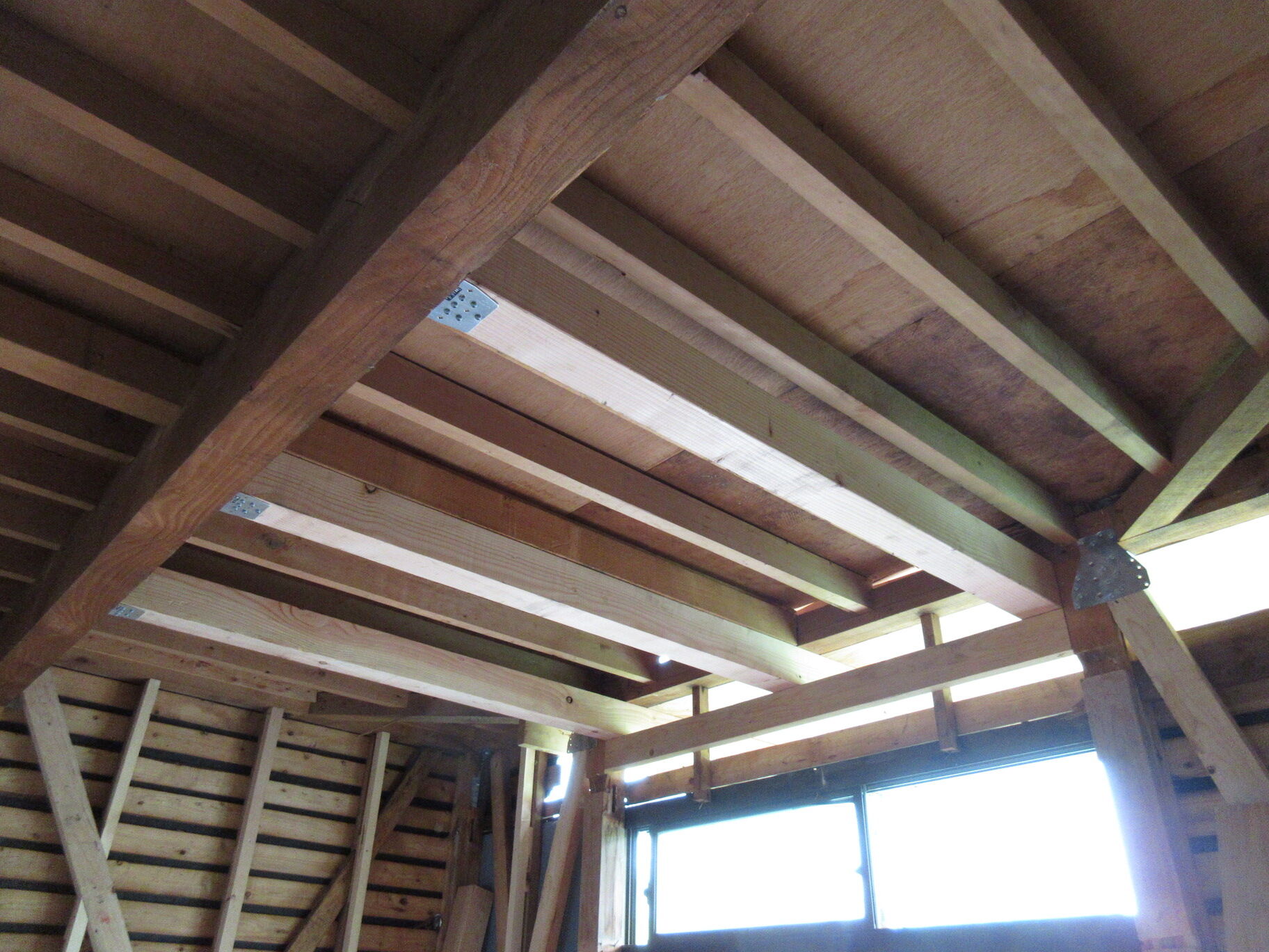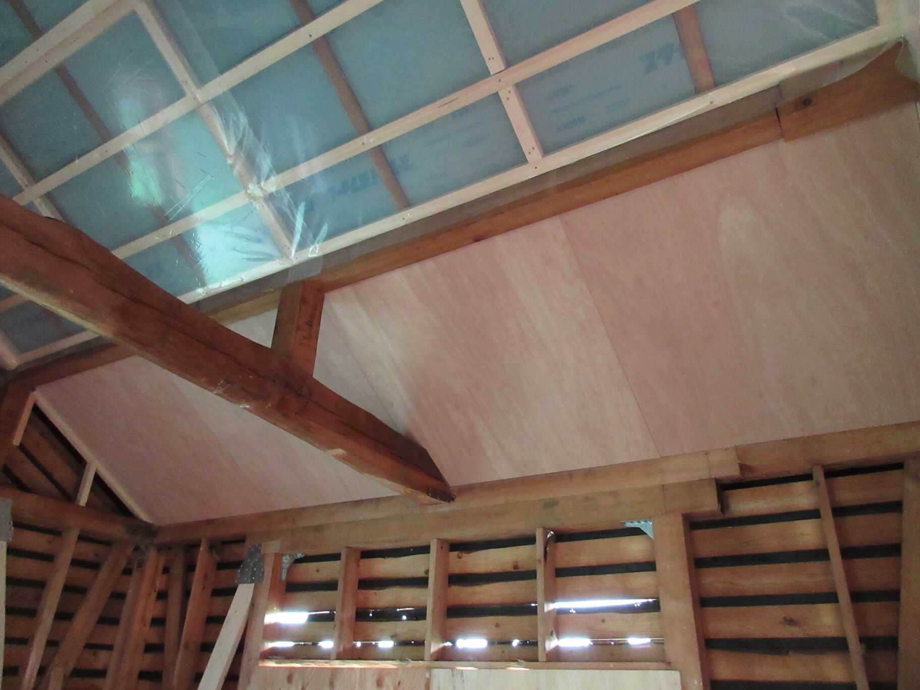 と思っていたら2階の勾配天井はもうラワン合板が貼られているではないか。内外部との絡みはなかったかな?配線や配管はしてあるっけ?などと心配したけれどもどうやら大丈夫そうだ。監督さんが仕上を進めても大丈夫だと思われるところを確認しながら細やかに段取りをしているわけで、感心してしまった。