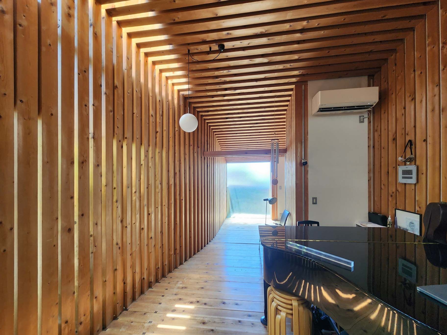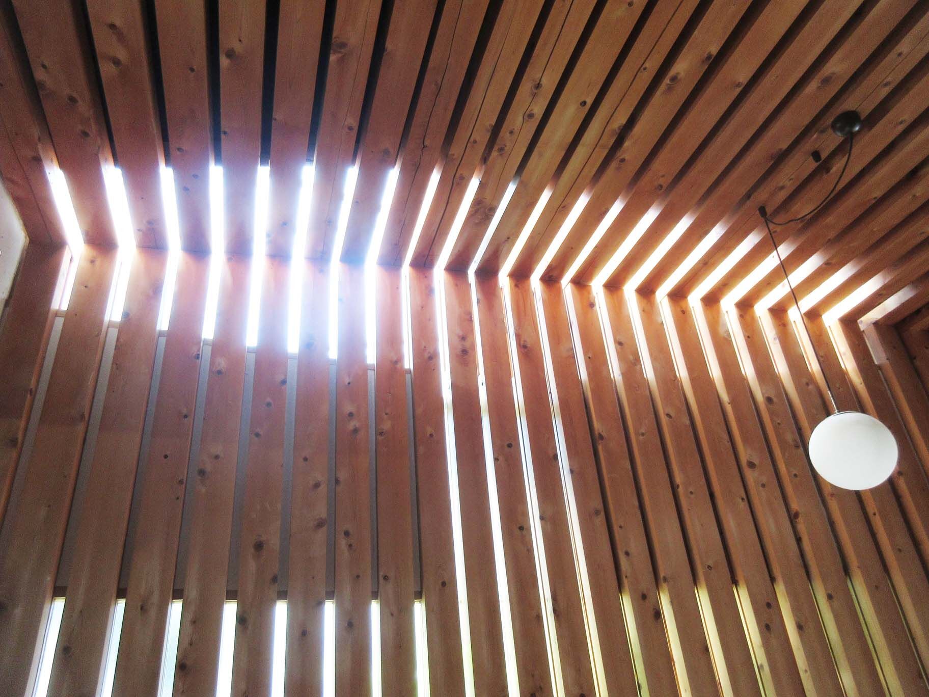 かといって閉鎖的ではなく、連続する角材の1寸の隙間からは光が漏れて明るく、壁の一部や天井では曲面を描いて幻想的な空間になっている。隙間にはガラス戸が入り込むなど余分な要素を削ぎ落とすディテールにかなり力が入っていた。