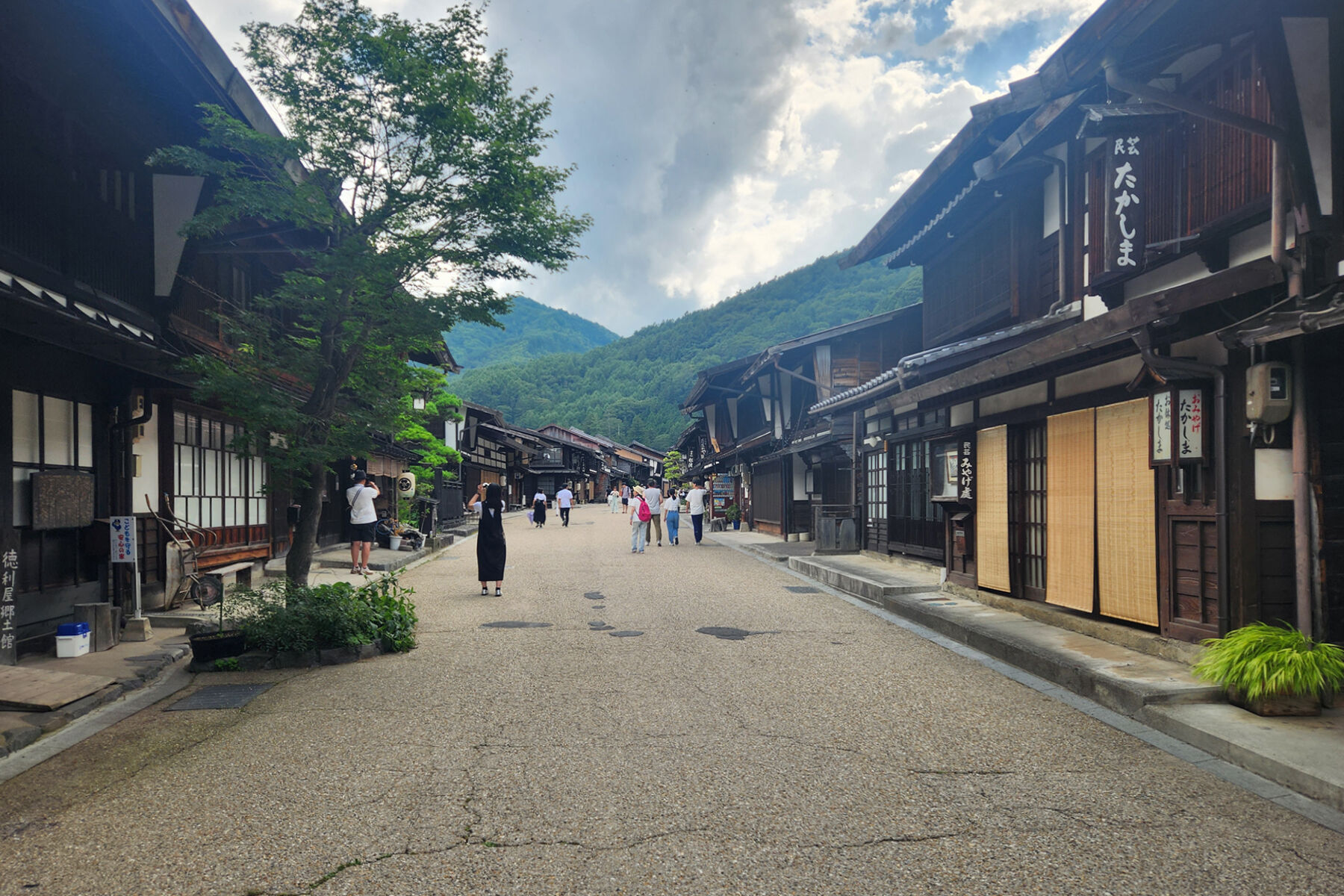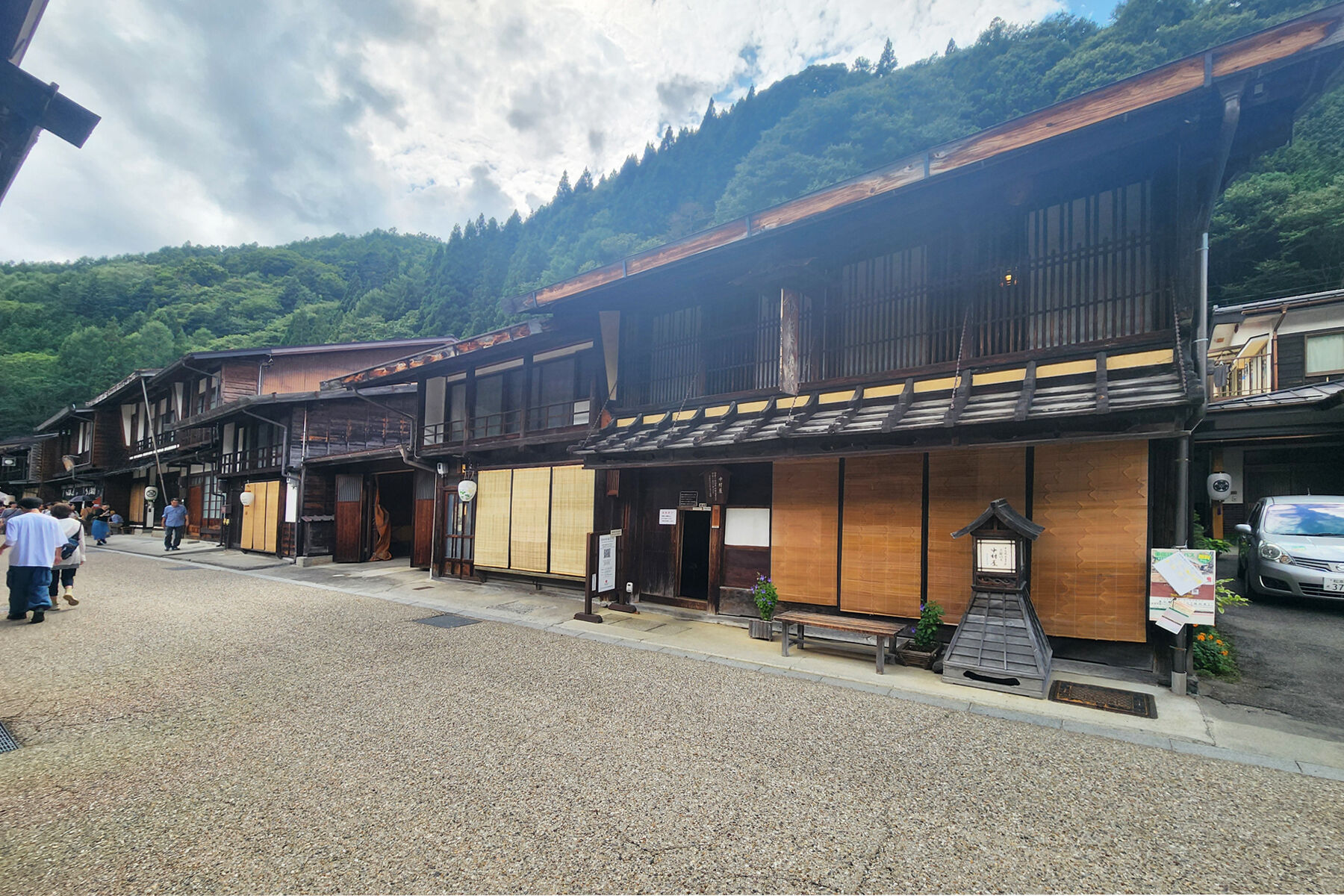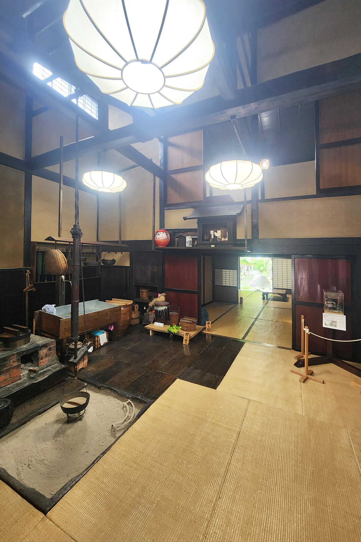 途中で「旧中村家住宅」の内部を見学。漆塗りの櫛を製造していた問屋で、その面影を残しつつも間取りなどは宿場町の最も一般的な形式のものだそうだ。背の低い潜戸を抜けると片側の土間が廊下のような役割で奥まで貫いている。大胆に小屋組みが現れた吹抜は壮観で、ここがメインのハイライト空間であることが分かる。