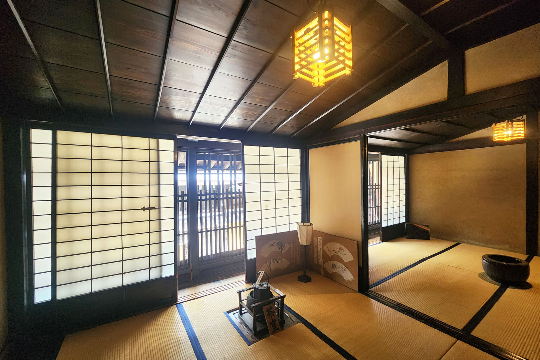 そこから入口側の表と、庭に続く奥の部屋が続き間でつながっていて、表は店舗や商談の場として、裏は休息の場として機能も容易に想像できる。現代では考えられない天井の低さが、むしろヒューマンスケールで心地よい。