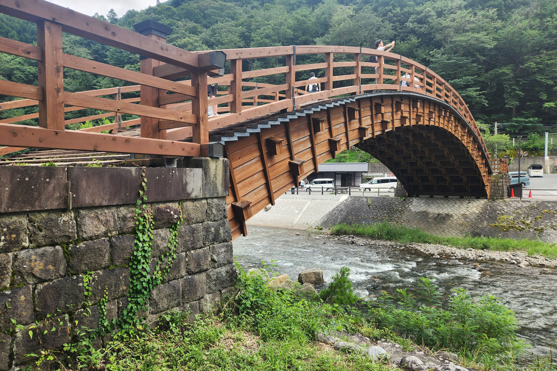 奈良井宿は数年前に竹中工務店やツバメアーキテクツによって、古民家の改修や新たな施設によって地域活性のプロジェクトが進んだらしい。その割にはあまり通りが賑わっている感じがしなかったのは残念。観光の人は多かったけど、店舗として入れるところはポツポツで、1kmというのは長すぎるのかもしれない。古き良きを残すのは大事だが、実際に住んだり活用するとなると課題は多いのだろうと想像する。車道から見える「木曽の大橋」は岩国にある錦帯橋を模してつくられたそうで、規模は違うがなかなか迫力のあるものだった。