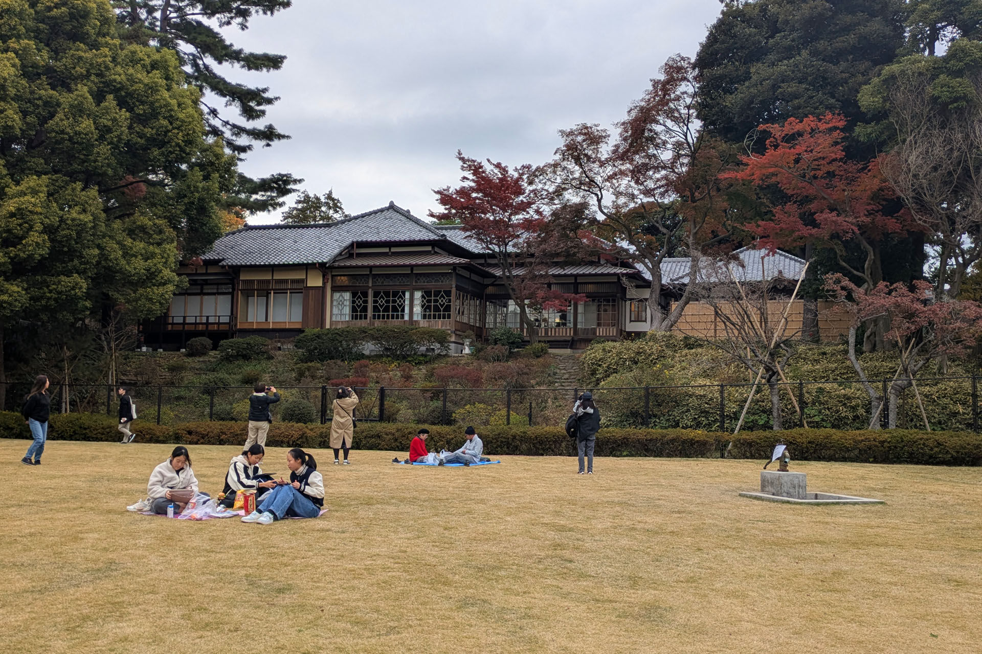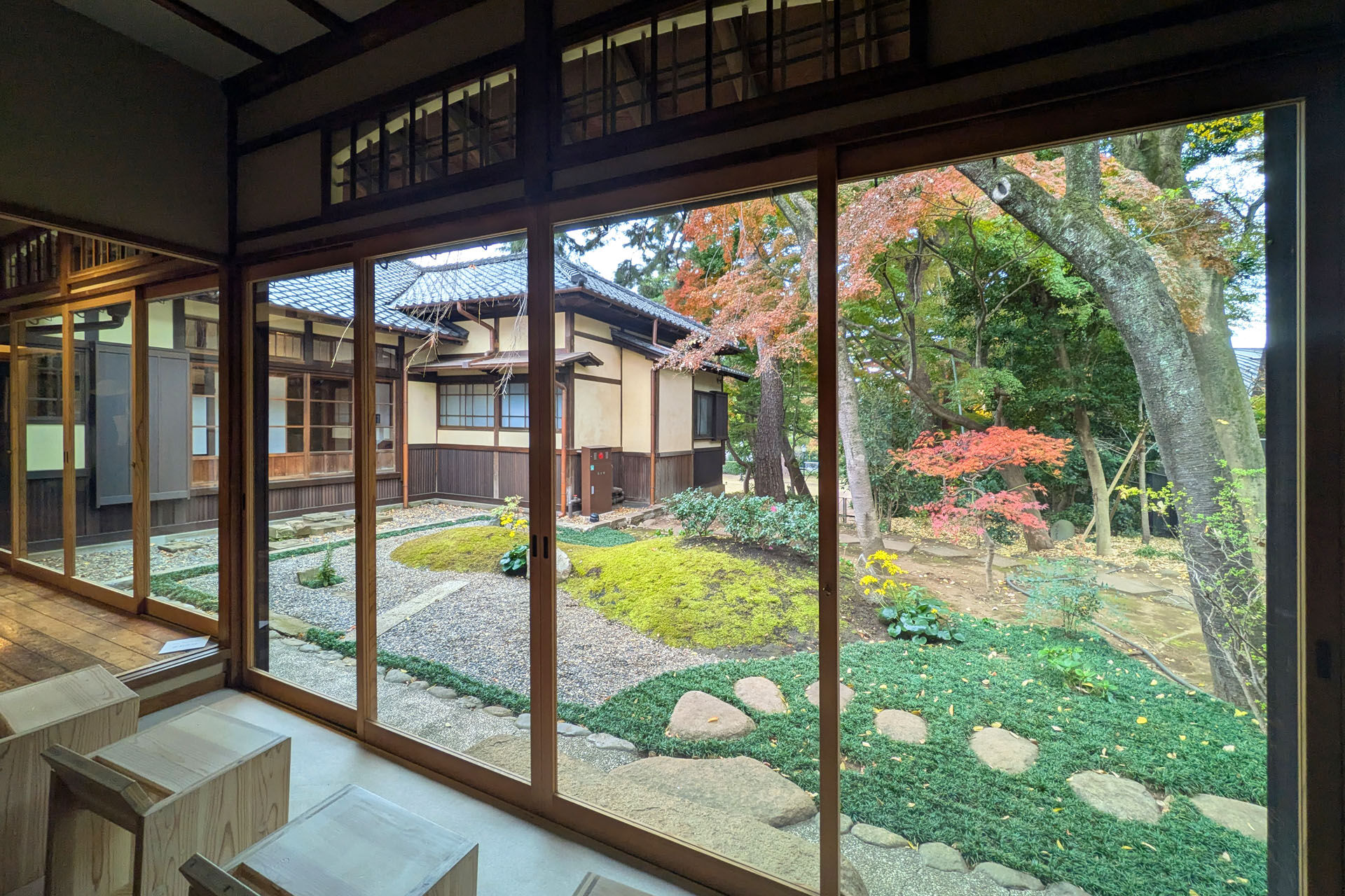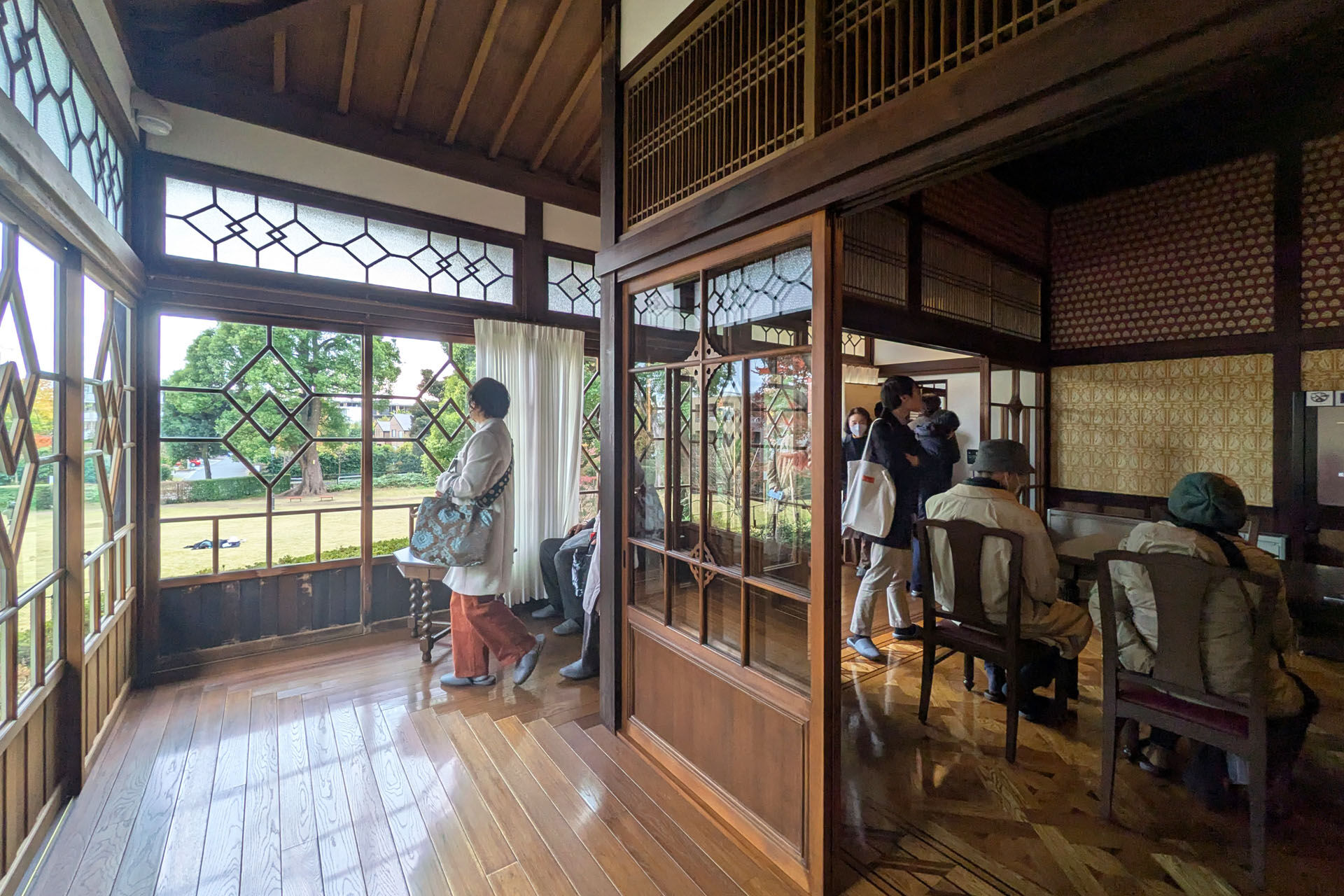 基本的には日本的な書院造りの様式だが、要所に西洋や中国の意匠を取り入れている。創建時のタイルや壁紙や家具など、材料や仕上を残存する一部あるいは過去の写真から再現する作業は根気のいる作業だったようだ。自分も勤めているときに文化財保存に関わったことがありその苦労は想像できるが、過去の写真などから素材や色を想像して特注再現するのは楽しかったことを思い出す。特に高い天井の開放性と、庭とつながるガラス戸の様々な桟のデザインのフィルタが美しい。南側に面する芝生広場は以前と変わらず一般開放されていて、子供と時々遊びに来たことを思い出す。