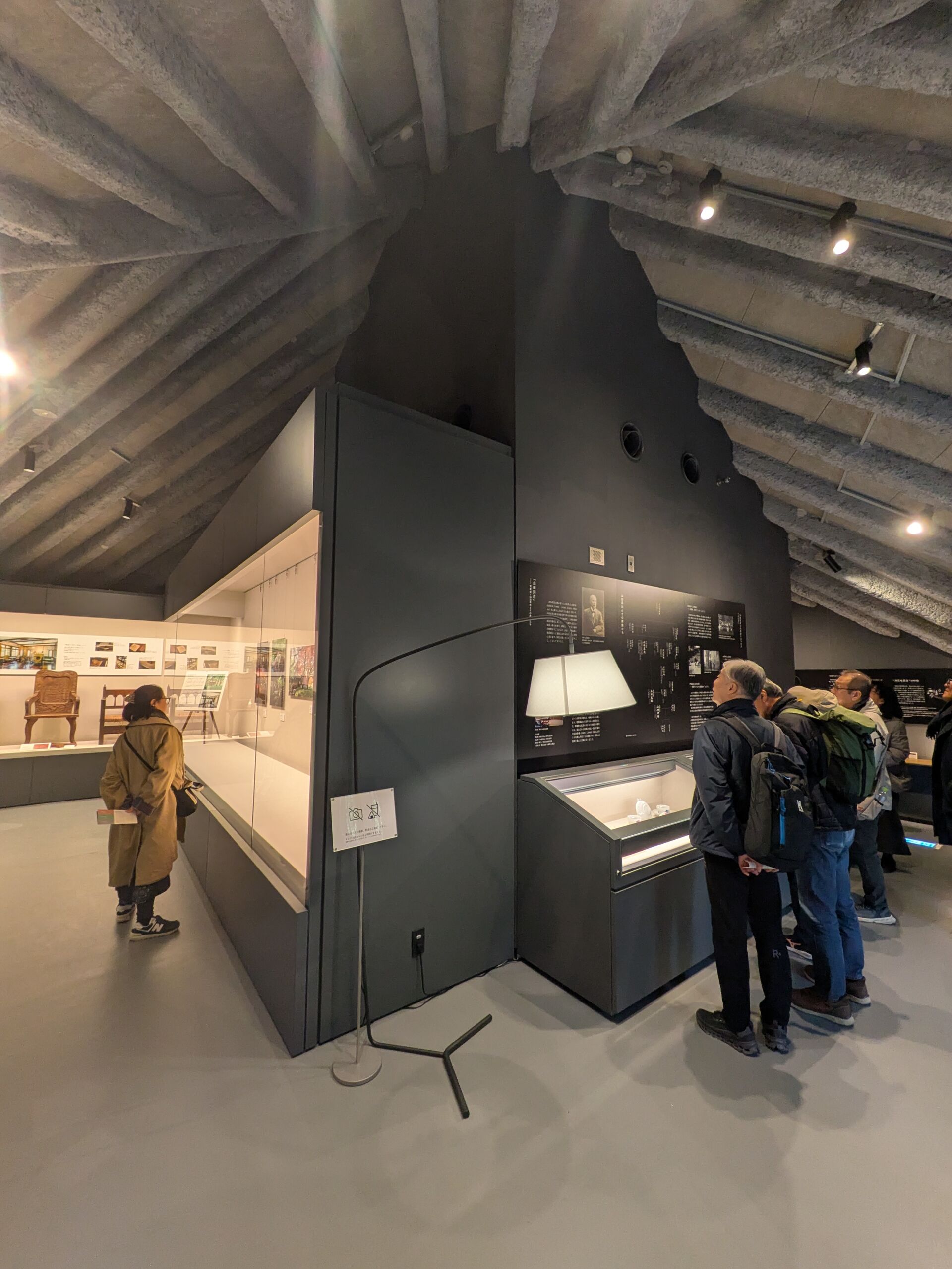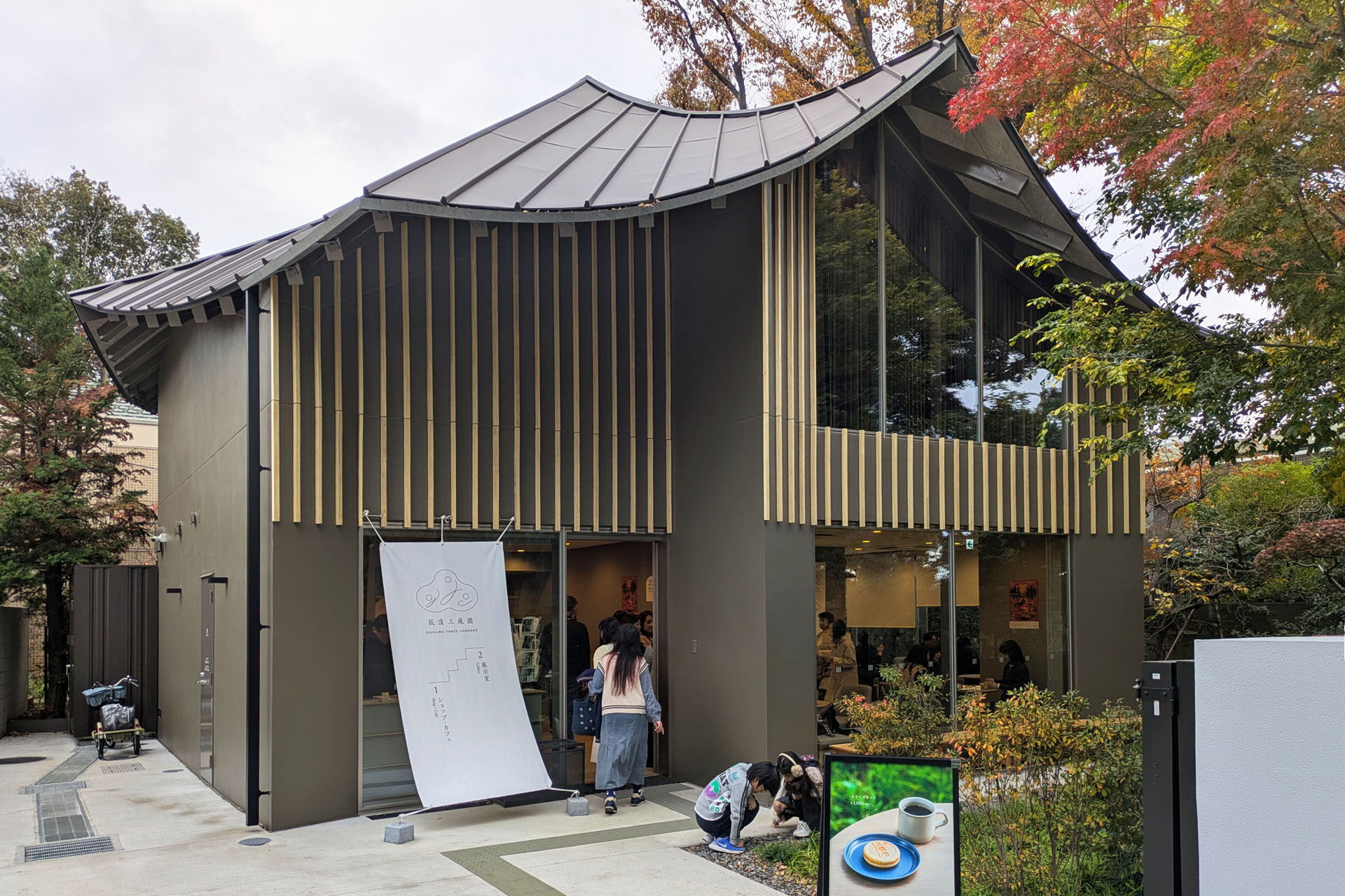 道を介した向かい側には展示棟がこじんまりと建っている。プロポーザルで選ばれた隈研吾氏の設計として話題になっている施設でオープンして間もない。1階にカフェを有し、2階には荻外荘をはじめ荻窪の歴史や文化を伝える展示室がある。多角形の屋根と外部とつながる開放性が特徴ということで選定された。だがしかし、鉄骨の小屋組みとむき出しの耐火被覆、取って付けたようなルーバーも正直残念でならない。どうしてこうなってしまったのか。
