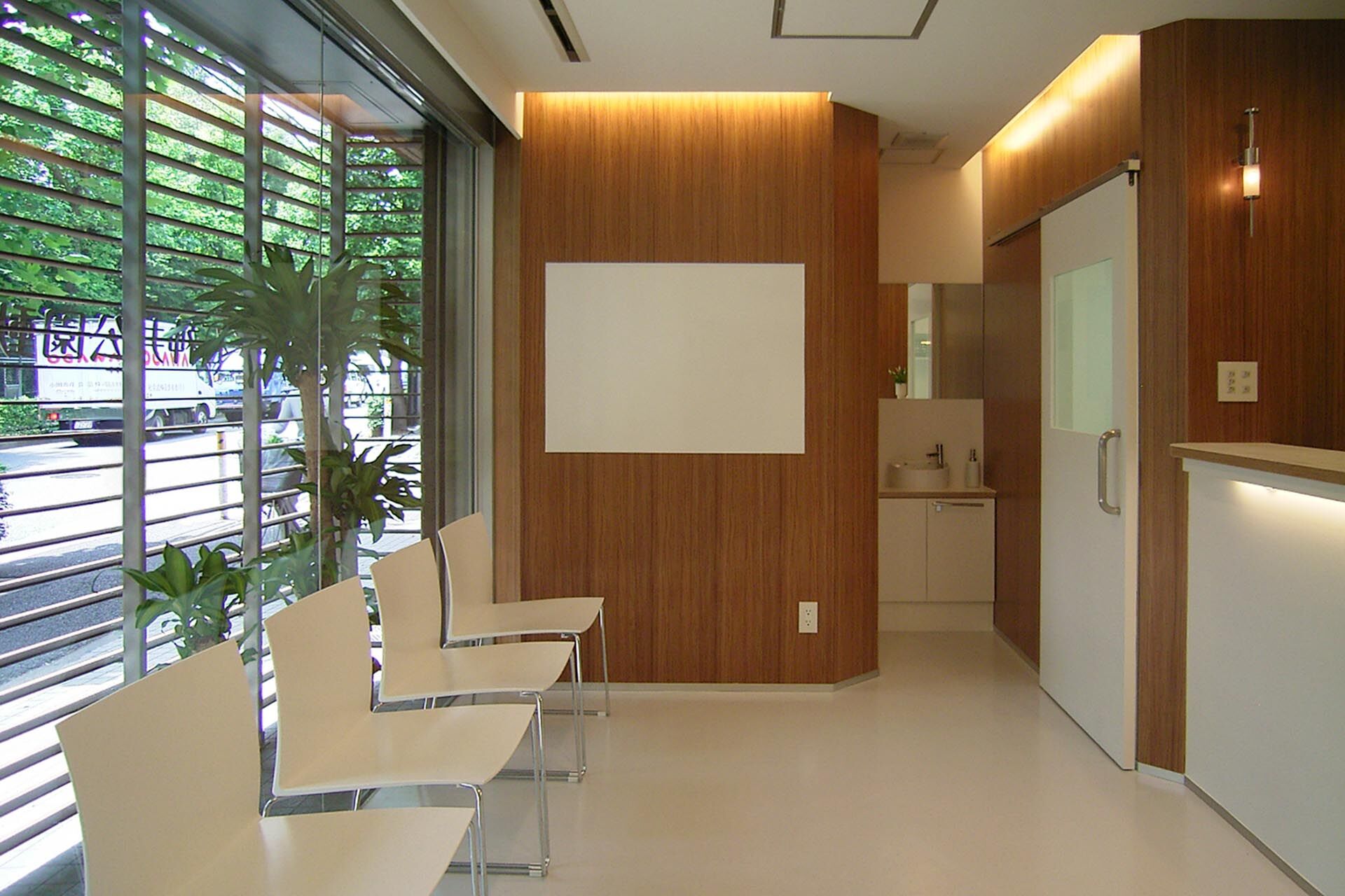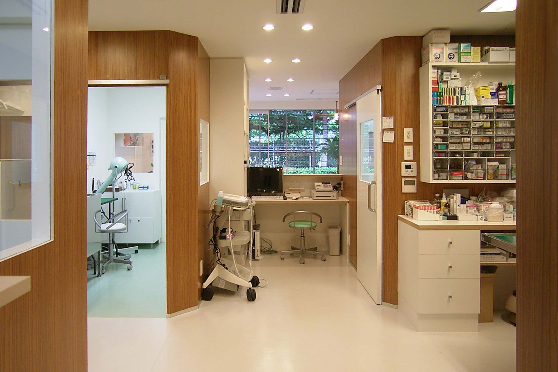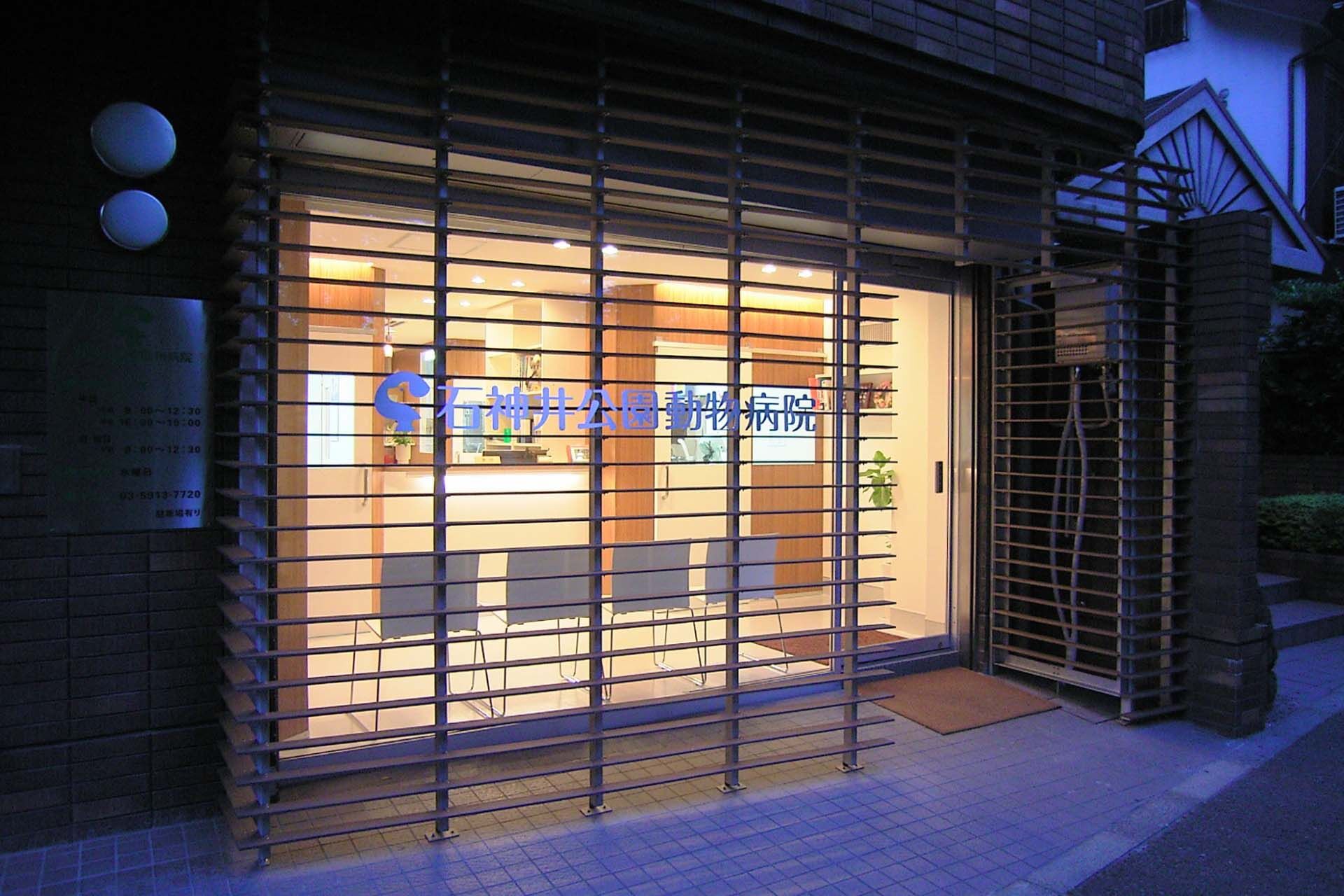 マンション1階テナント部分を動物病院にするための、内装+ファサードの設計。テナントという限られた広さの中に様々な機能別諸室が必要なため、通過空間である廊下も有効に使用する構成を考えた。部屋として閉じる機能を4つの箱として隅に配置し、残余空間を待合・受付・検査・物置・医局として使えるようにしている。また、箱の隅は45度にカットし、残余空間に広がりを感じさせ、かつスムーズな軌跡で交通量の多い動線に配慮した。外部はバッファゾーンを確保する位置に木製ルーバーを設けて日射を遮り、緩やかに内部の様子を伝えつつ、周囲の緑にとけ込むファサードとしている。