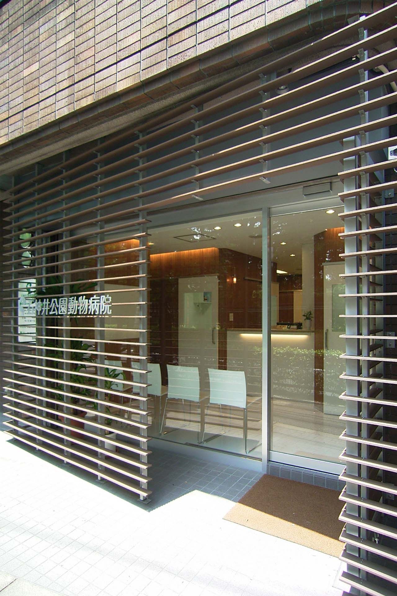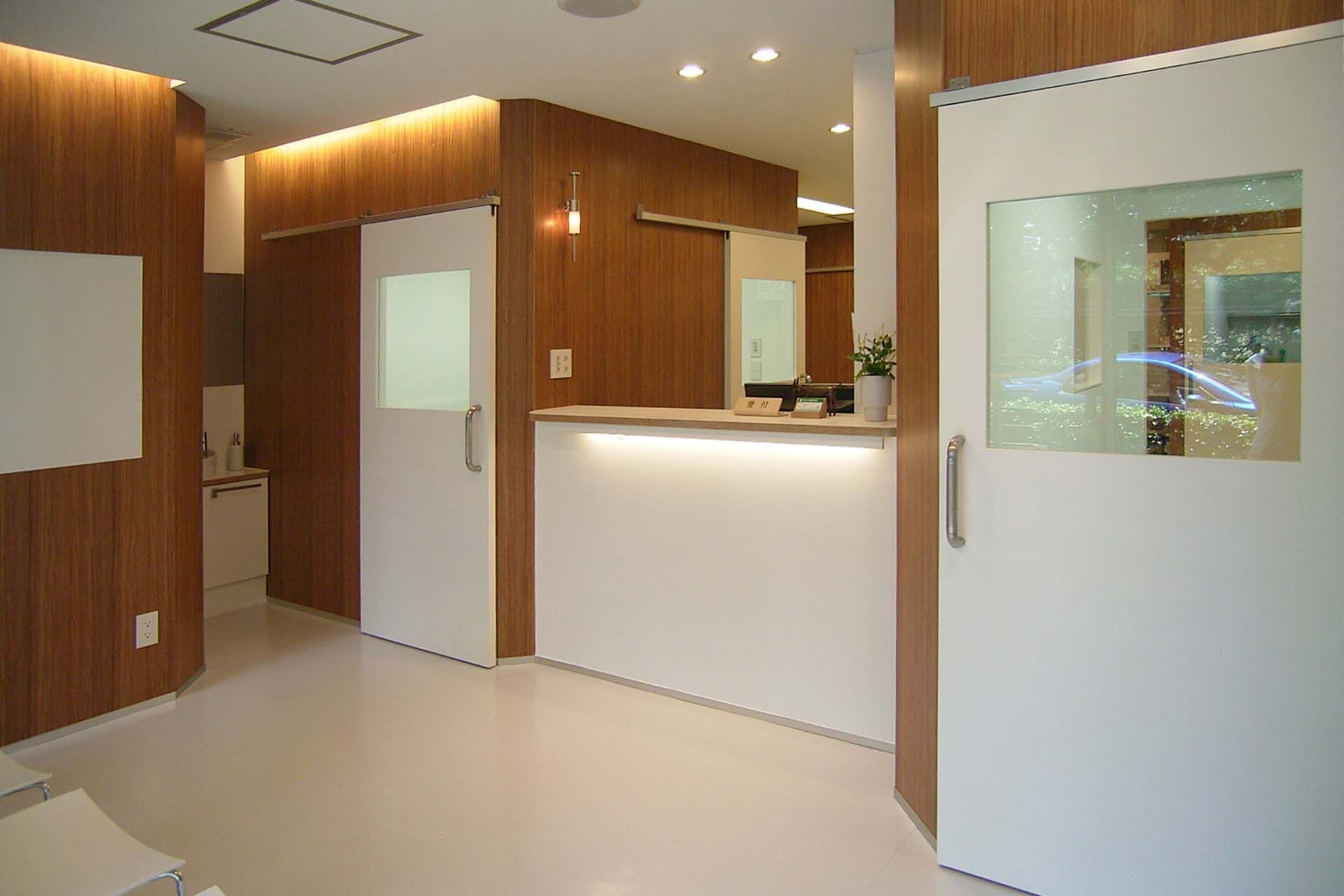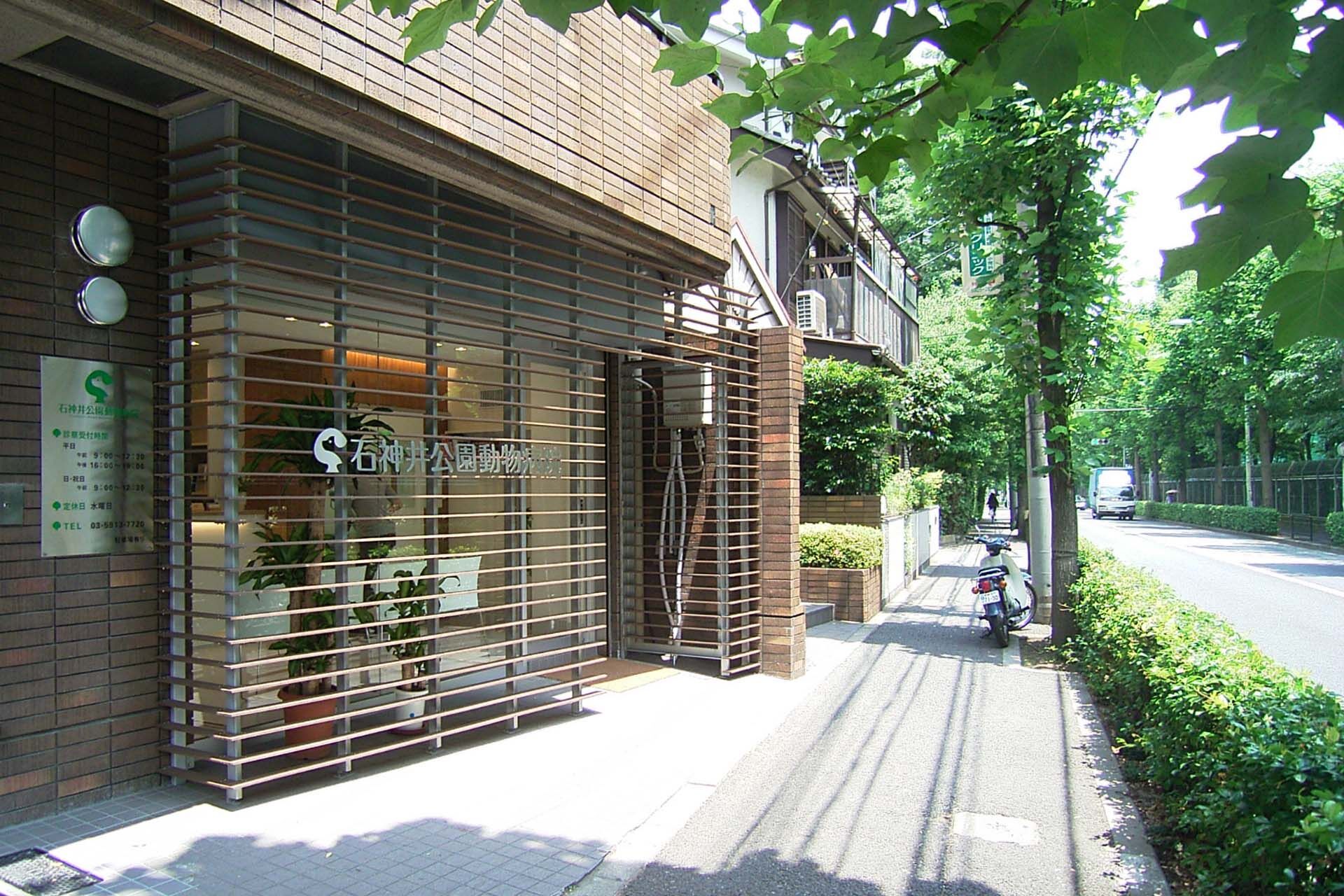 マンション1階テナント部分を動物病院にするための、内装+ファサードの設計。テナントという限られた広さの中に様々な機能別諸室が必要なため、通過空間である廊下も有効に使用する構成を考えた。部屋として閉じる機能を4つの箱として隅に配置し、残余空間を待合・受付・検査・物置・医局として使えるようにしている。また、箱の隅は45度にカットし、残余空間に広がりを感じさせ、かつスムーズな軌跡で交通量の多い動線に配慮した。外部はバッファゾーンを確保する位置に木製ルーバーを設けて日射を遮り、緩やかに内部の様子を伝えつつ、周囲の緑にとけ込むファサードとしている。