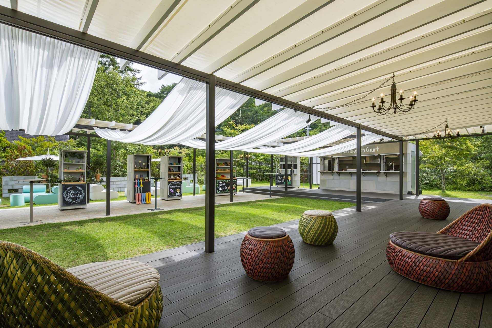 星野リゾートが運営するガーデンウェディング会場の改修工事。室内会場に面する既存のテラスに平行して対のテラスをつくり、その間にもう一つの場を生み出している。室内会場の壁は一面取り払い、全面がガラス戸となって室内外をつないでいる。室内から徐々に外部/自然へといくつかのレイヤーが連続する構成である。テラスには白い垂木を架け、その間に白いタープを張ることでパーティに相応しい非日常的な場をつくることができる。また、テラスに設置する家具に見立て たマルシェ(屋台)やキッチンカートなどもトータルに設計し、外にいながら室内のようなくつろぎを感じられるようにした。